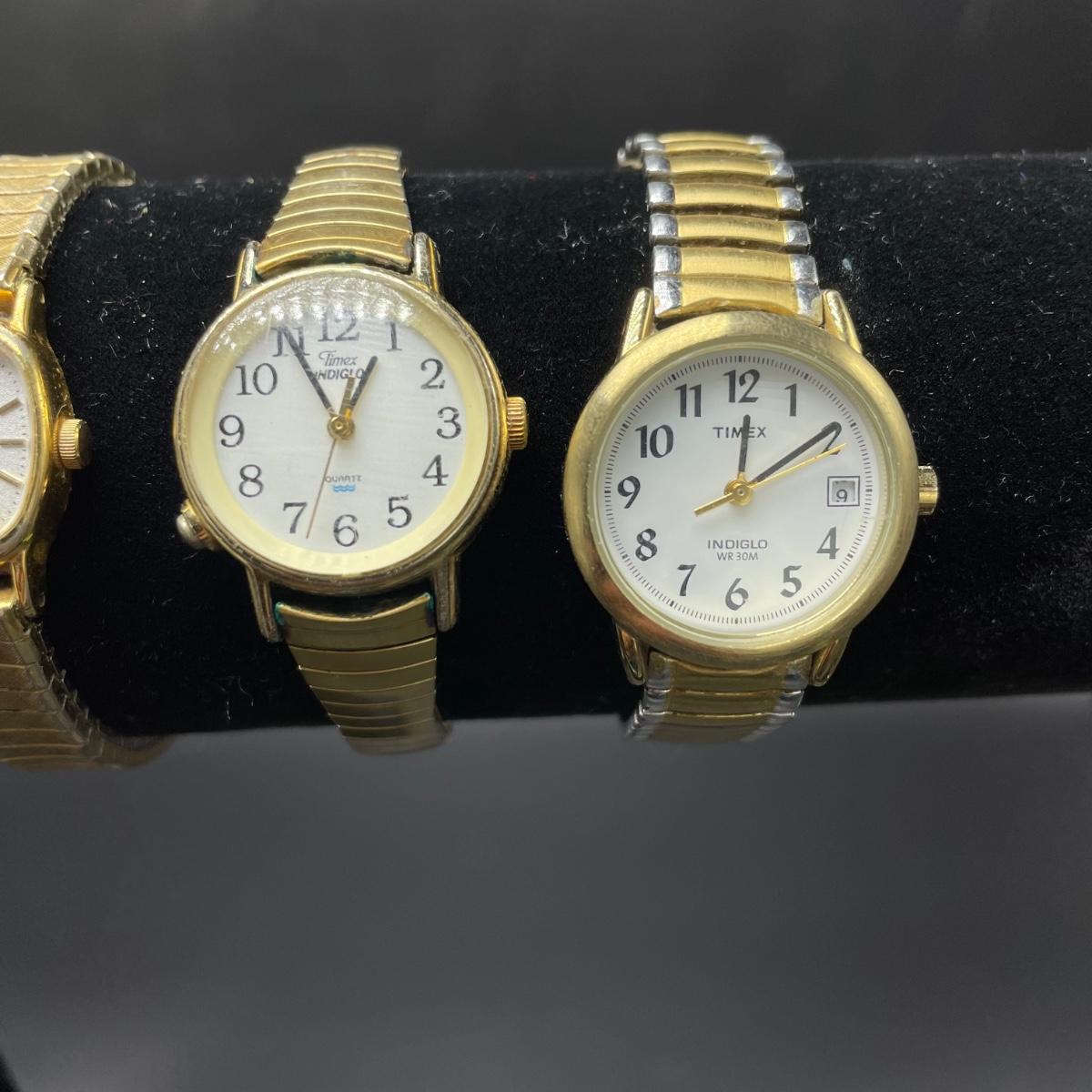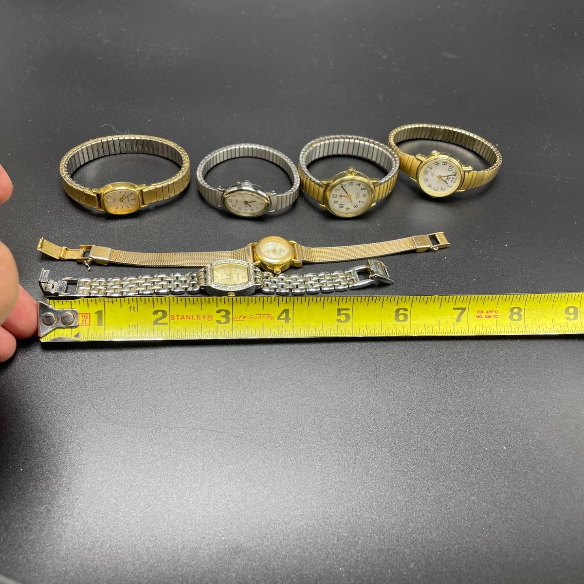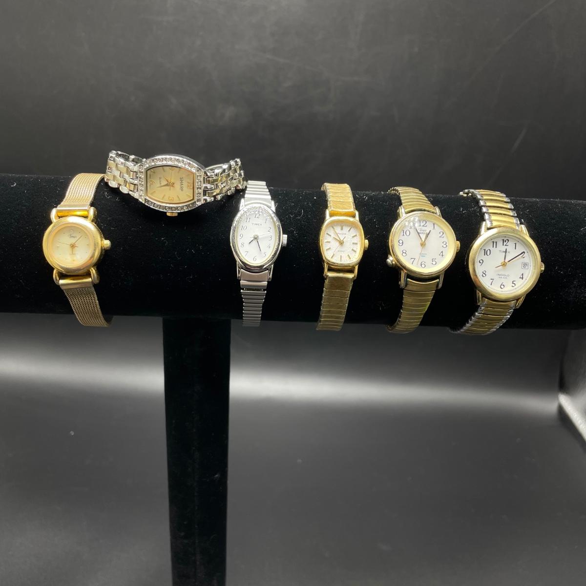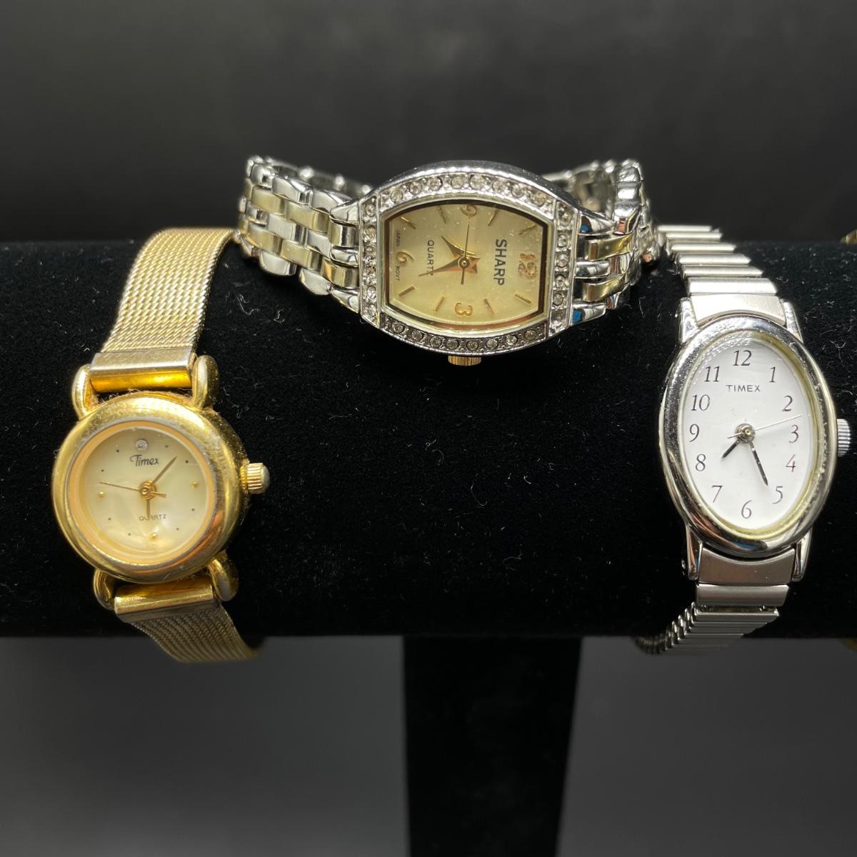 Six ladies watches. Four by Timex, one by Pulsar and one by Sharp. Four are elastic and metal bands, two have clasps. None are in working order, but appear to only need new batteries. See images. Shipping available.