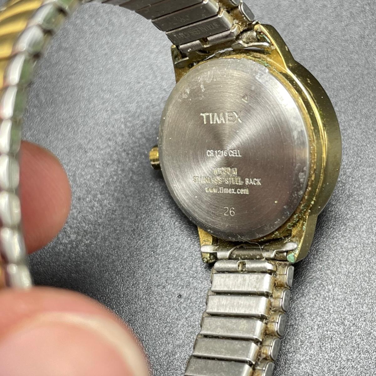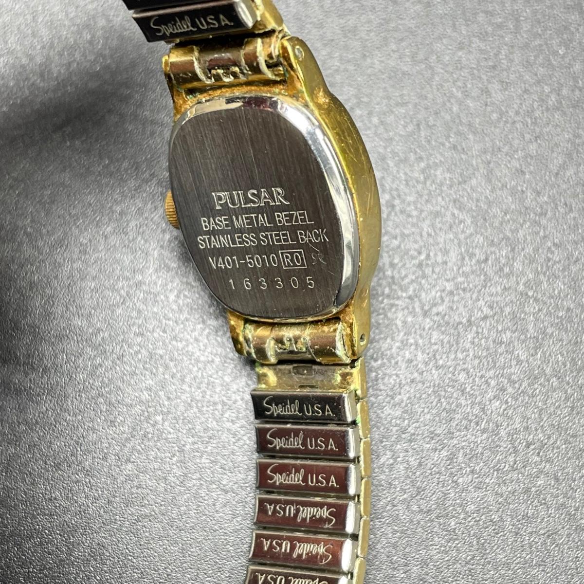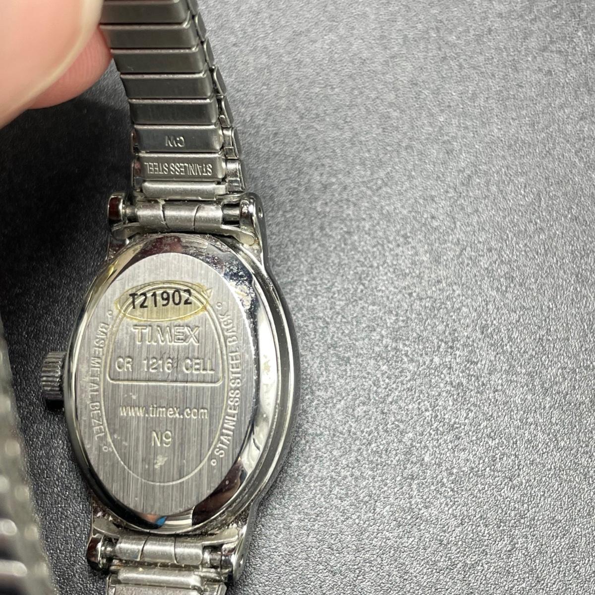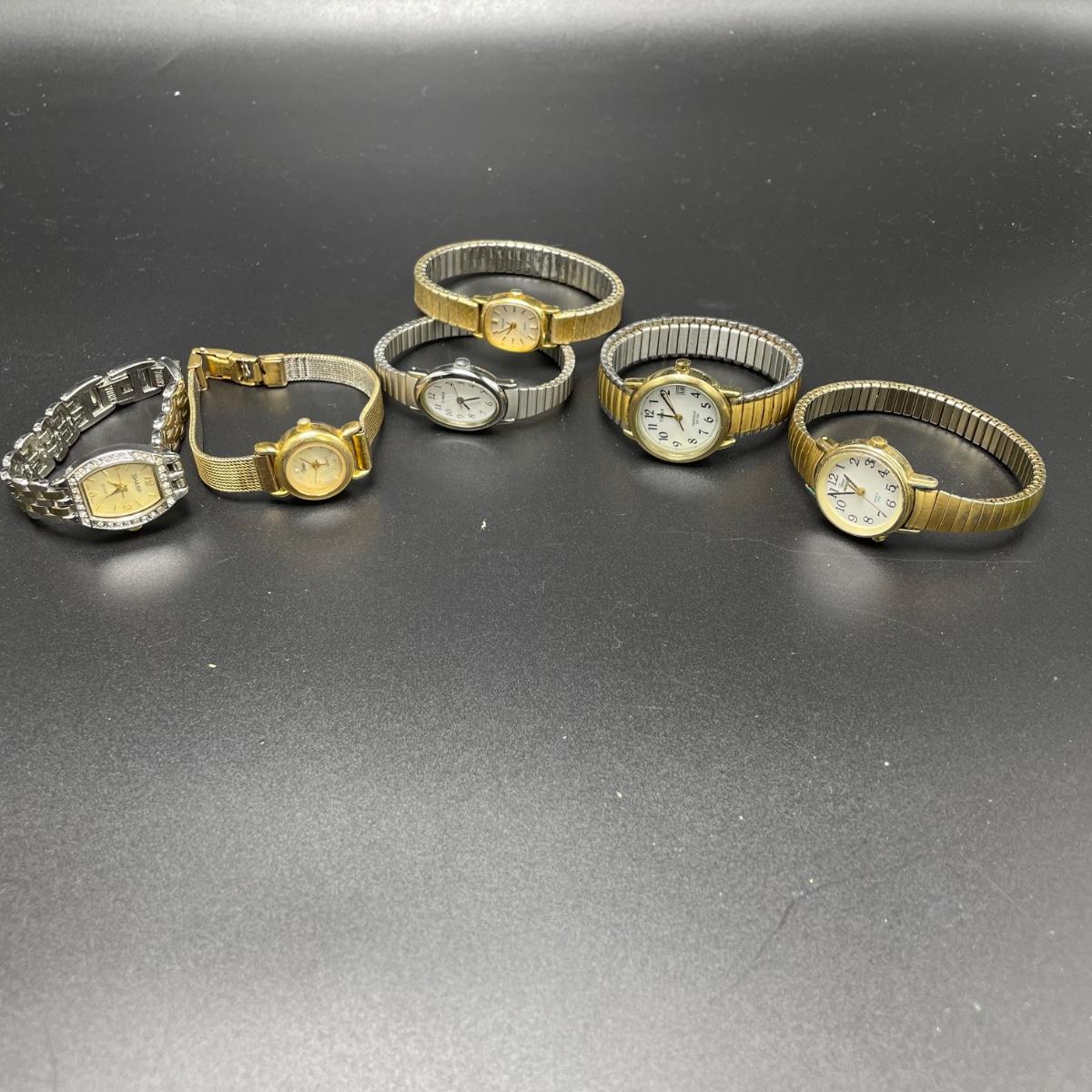 Six ladies watches. Four by Timex, one by Pulsar and one by Sharp. Four are elastic and metal bands, two have clasps. None are in working order, but appear to only need new batteries. See images. Shipping available.