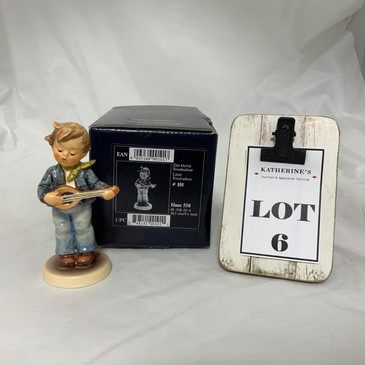 Who doesn’t want to be serenaded? Little Troubadour, Hum 558, 4 1/8” tall. TMK-7. Comes with original box. Please see photos for details and condition. - No Cracks, Chips or Crazing Noted. ::: Shipping is available on this lot. If you require shipping you must let us know at the close of the auction. We will coordinate with you after the item has been won. Shipping fees will include insurance up to or exceeding the value of all items being mailed. If you have any questions regarding this lot please contact the auctioneer either via this website, by direct email or by phone. PICK UP TIMES and other important information can be found in the TERMS and DESCRIPTION of the auction. Please take a look for pertinent information. Thanks!