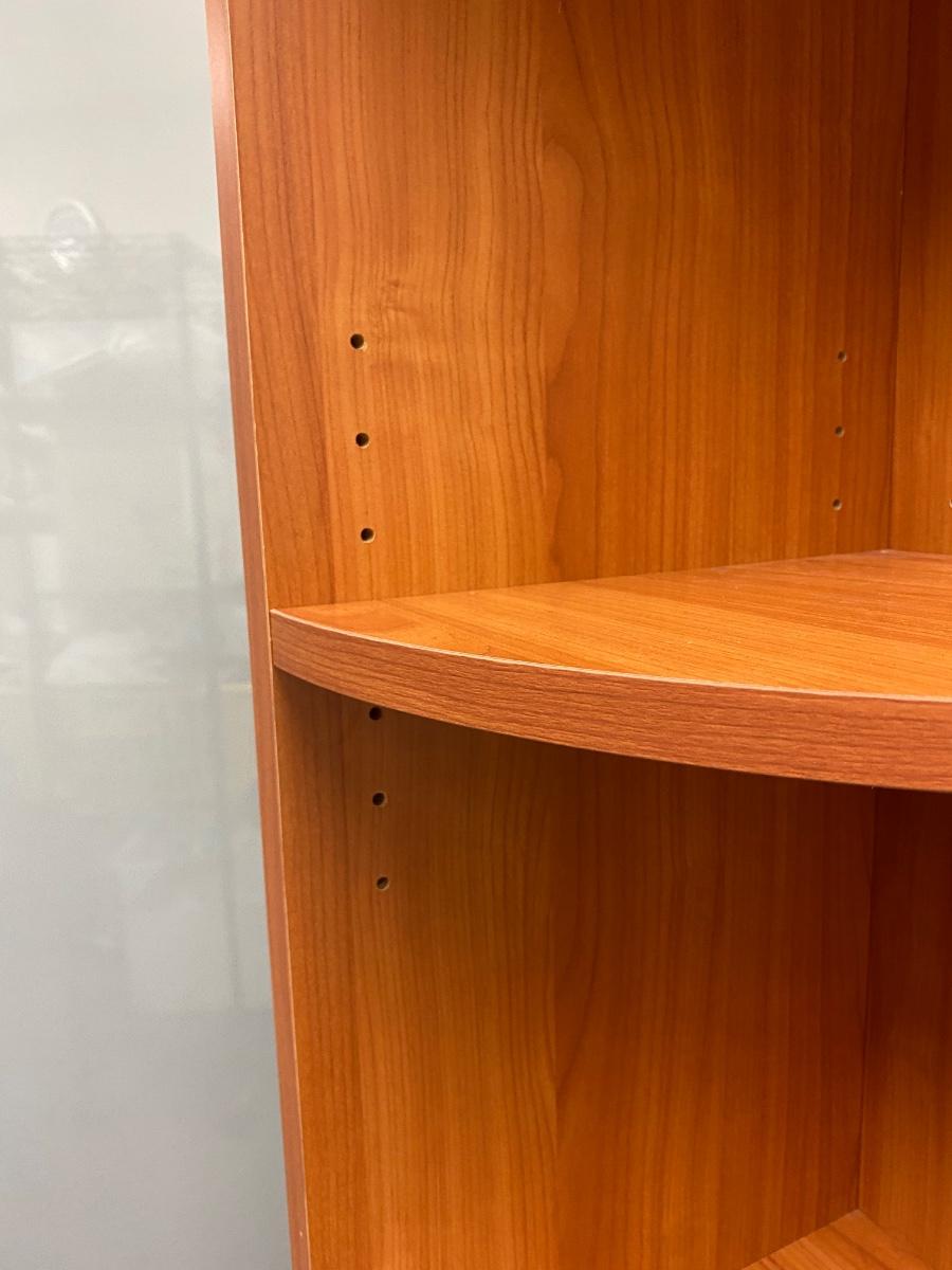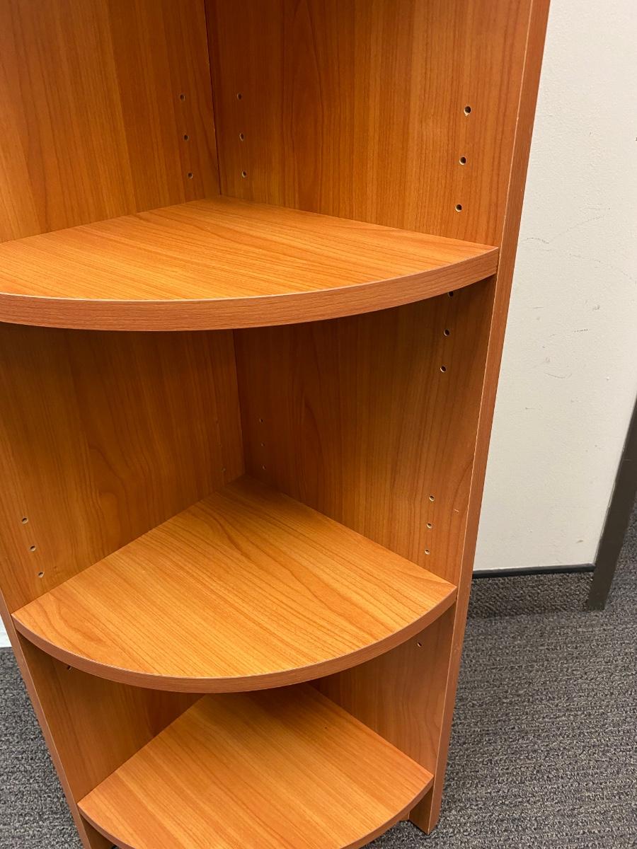 6' multi shelf corner bookshelf. In good condition. A few shelves are adjustable but previous owner put screws in the brackets for stability, would need to remove screws to adjust height.