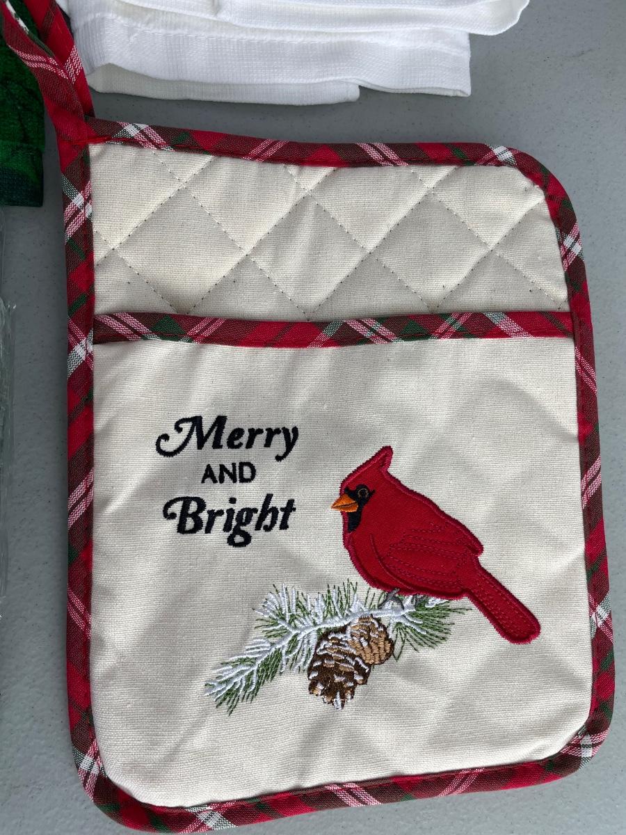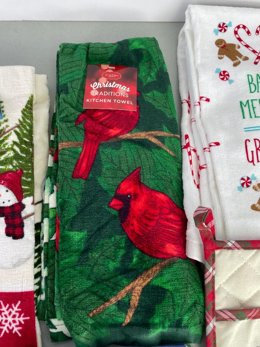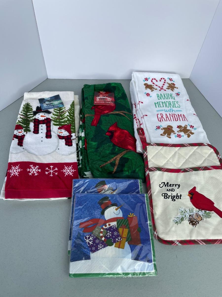 Towels are from Kohl’s. Three sets of 2 towels. New napkins, oven mit.