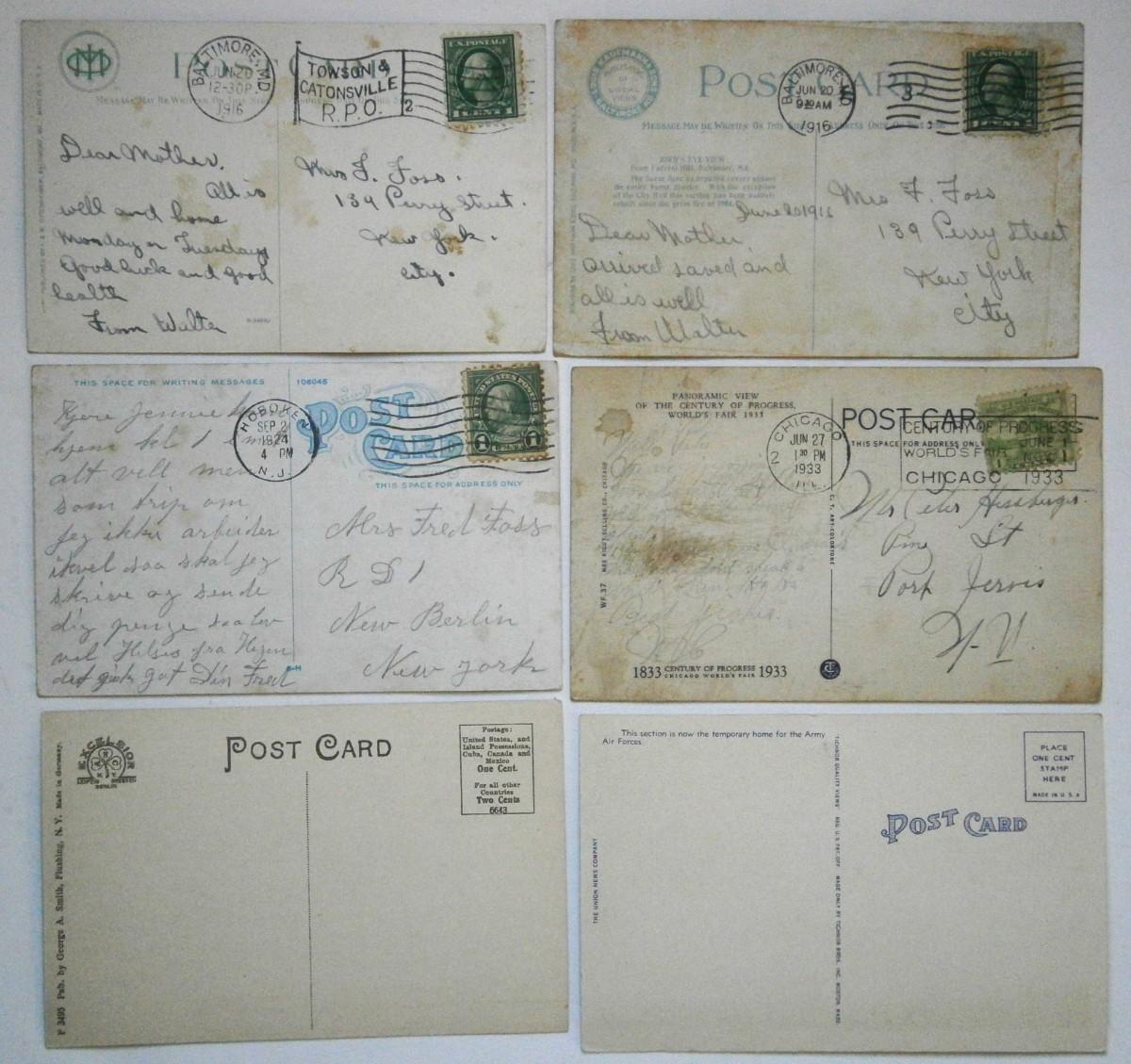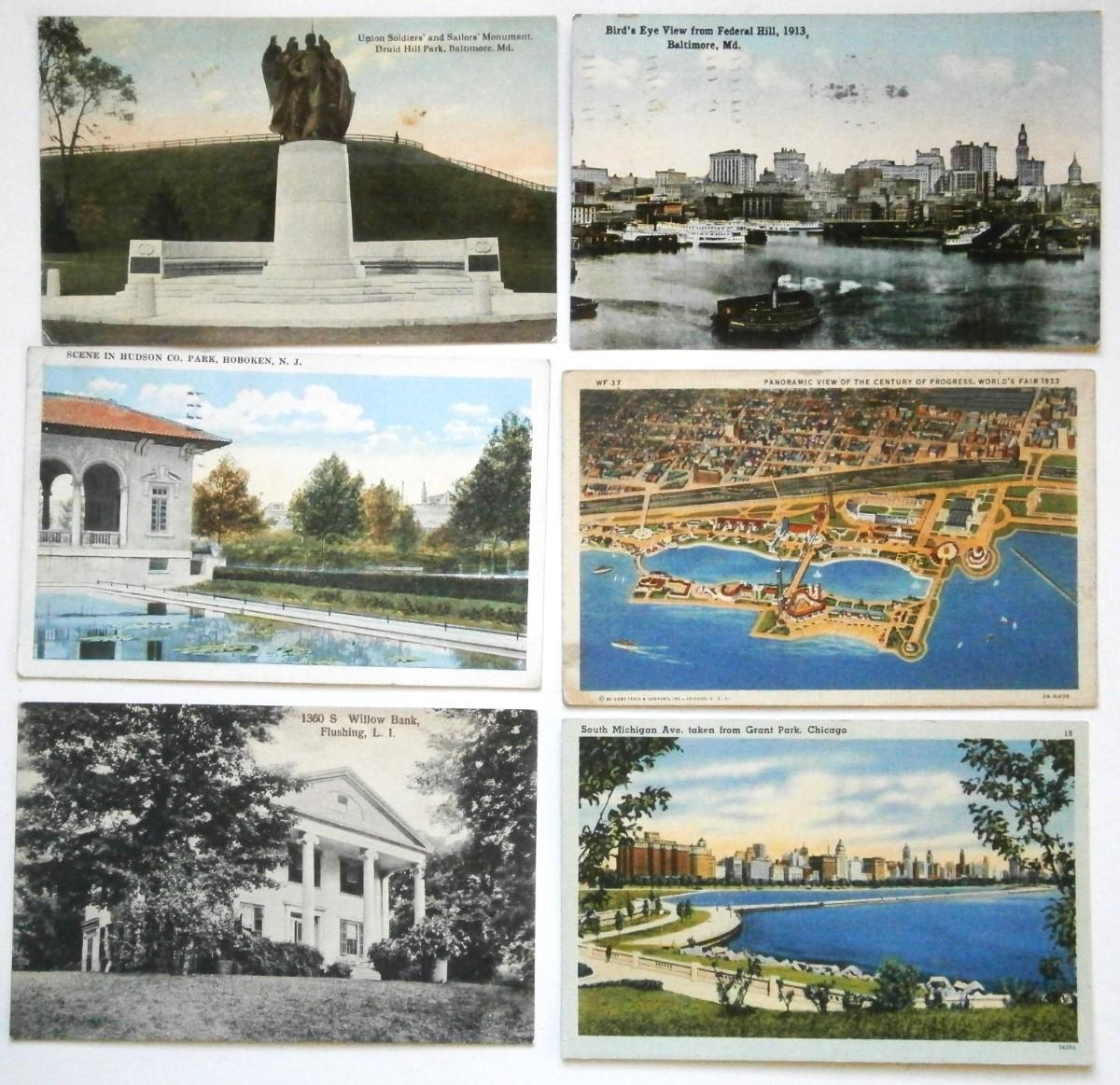 6 Older US View Postcards, standard size, 4 are used, includes a 1939 World's Fair and a R.P.O. Cancellation.