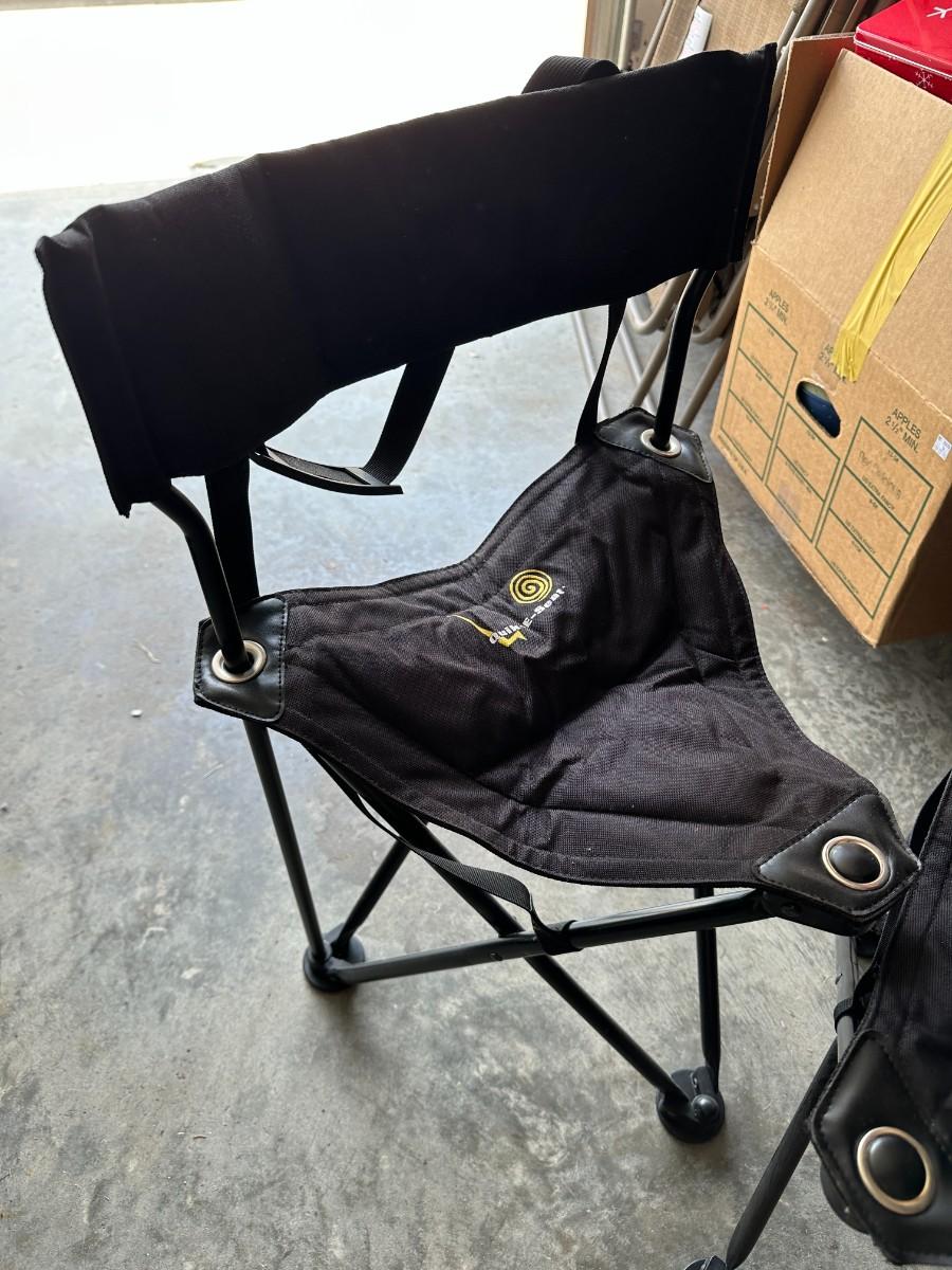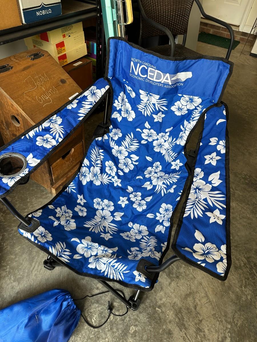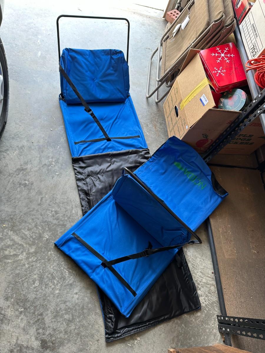 Outdoor Folding Chairs Lot- 2 folding "Quik-E-Seats", 2 folding blue floral low reclining-ish beach chairs, and 2 foldup blue beach lay-back-on-the-sand chairs