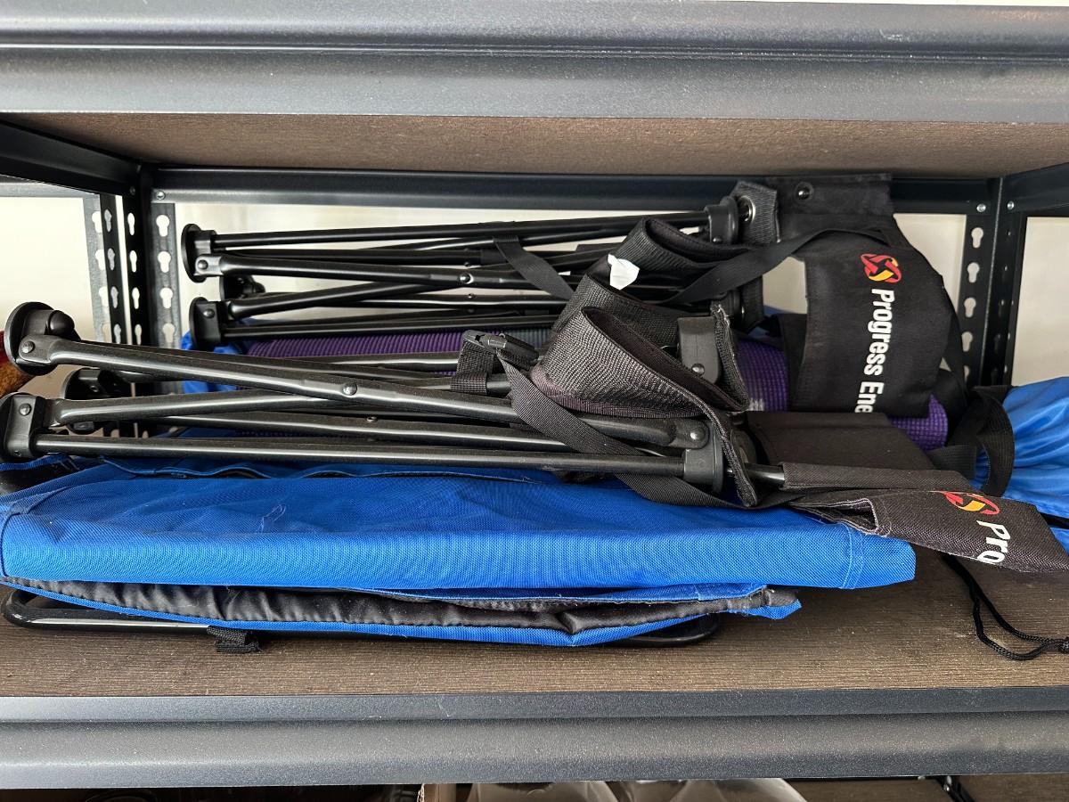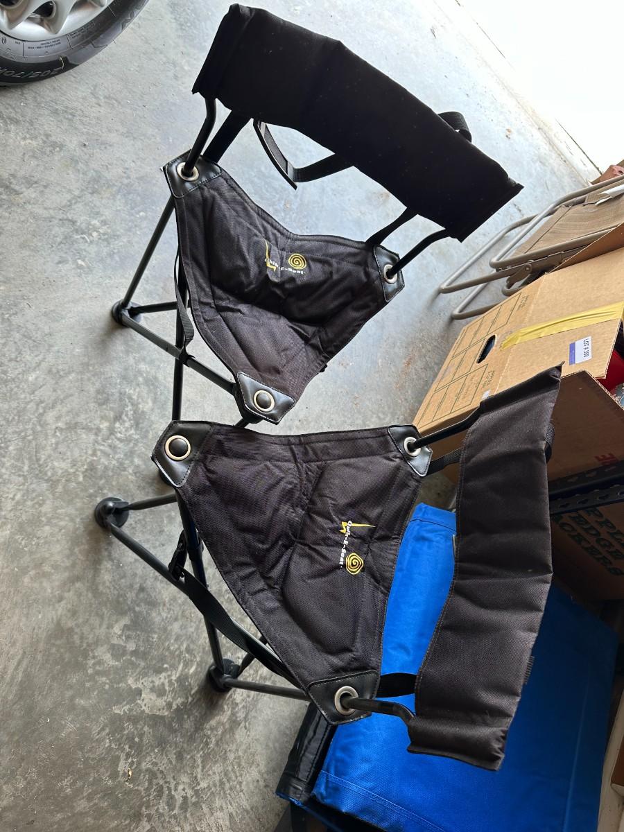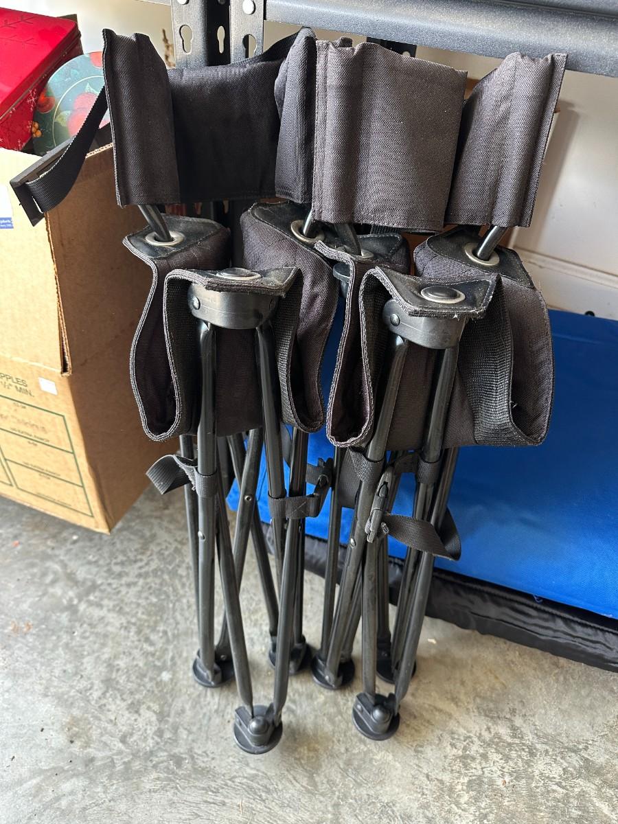 Outdoor Folding Chairs Lot- 2 folding "Quik-E-Seats", 2 folding blue floral low reclining-ish beach chairs, and 2 foldup blue beach lay-back-on-the-sand chairs