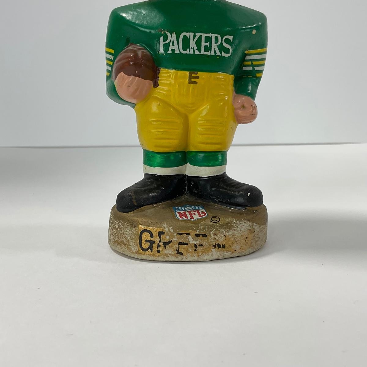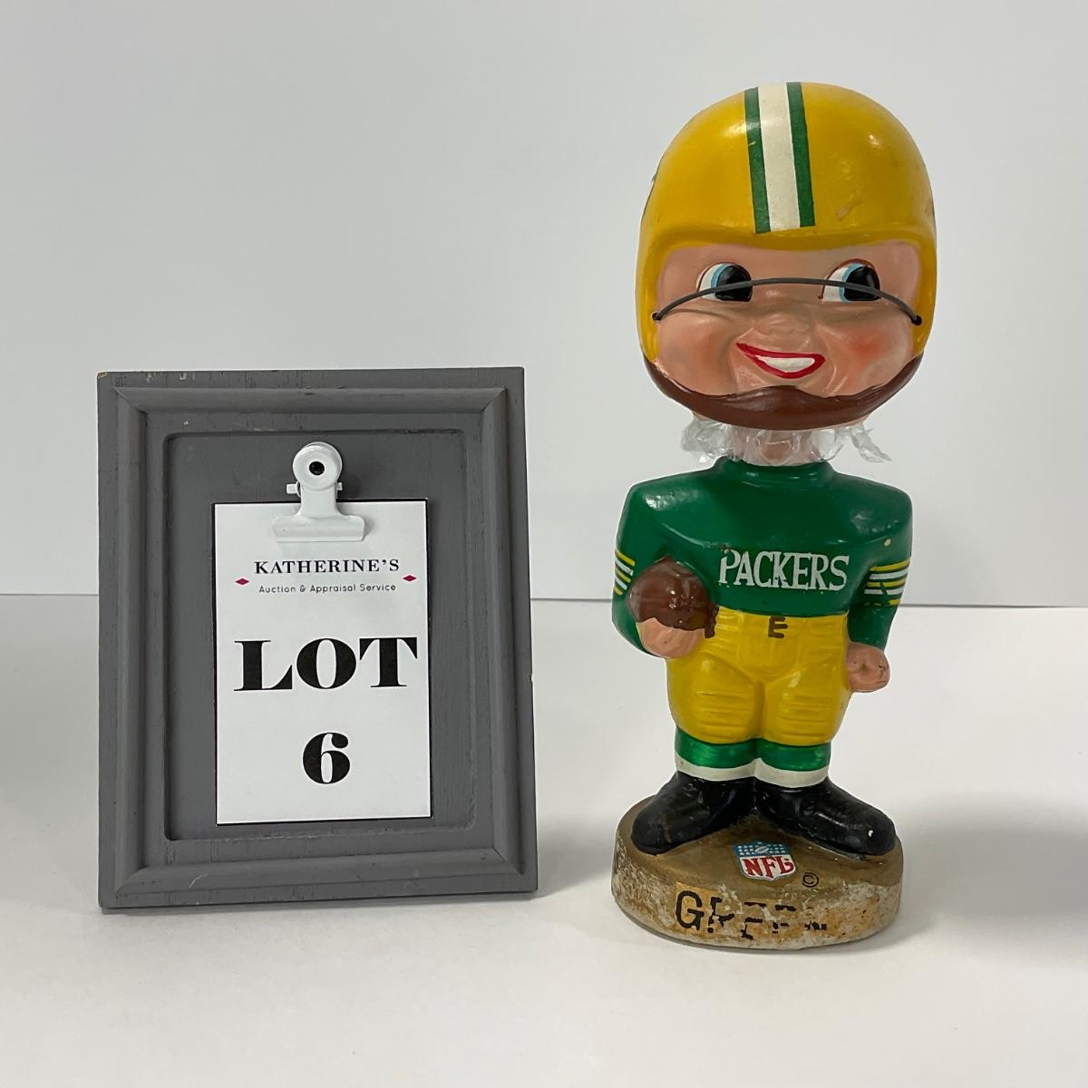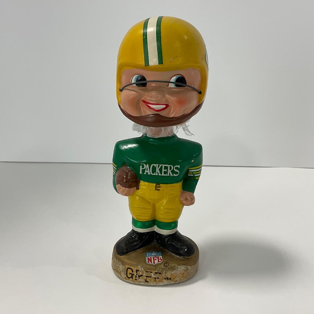 One vintage 1960’s Green Bay Packers Nodder. Please see photos for details and condition. ::: Shipping is available on this lot. If you require shipping you must let us know at the close of the auction. We will coordinate with you after the item has been won. Shipping fees will include insurance up to or exceeding the value of all items being mailed. If you have any questions regarding this lot please contact the auctioneer either via this website, by direct email or by phone. PICK UP TIMES and other important information can be found in the TERMS and DESCRIPTION of the auction. Please take a look for pertinent information. Thanks!