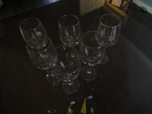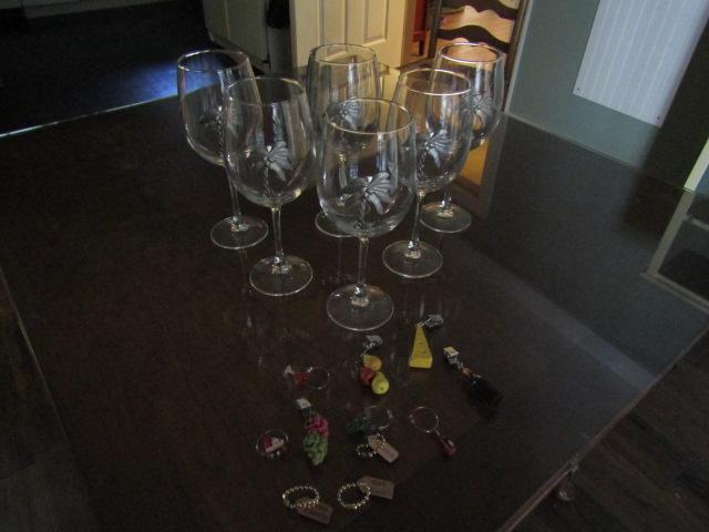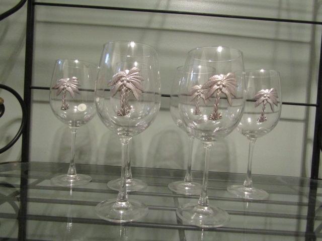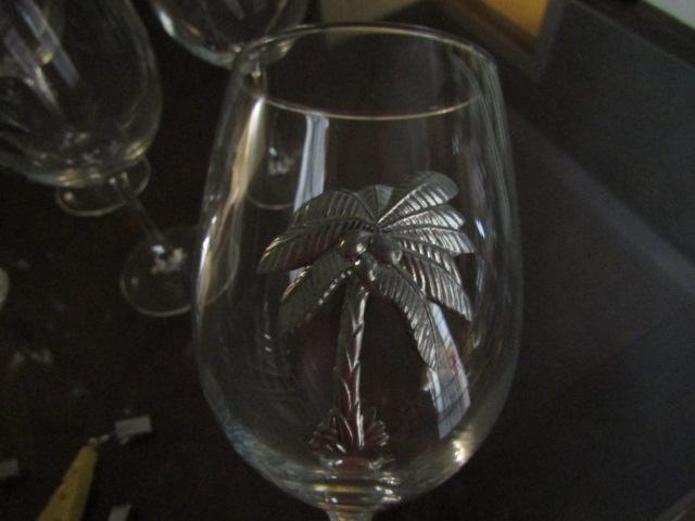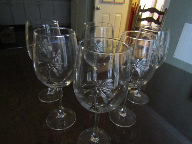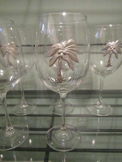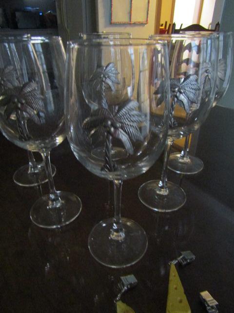 6 Palm Tree Theme Wine Glasses with Wine Charms