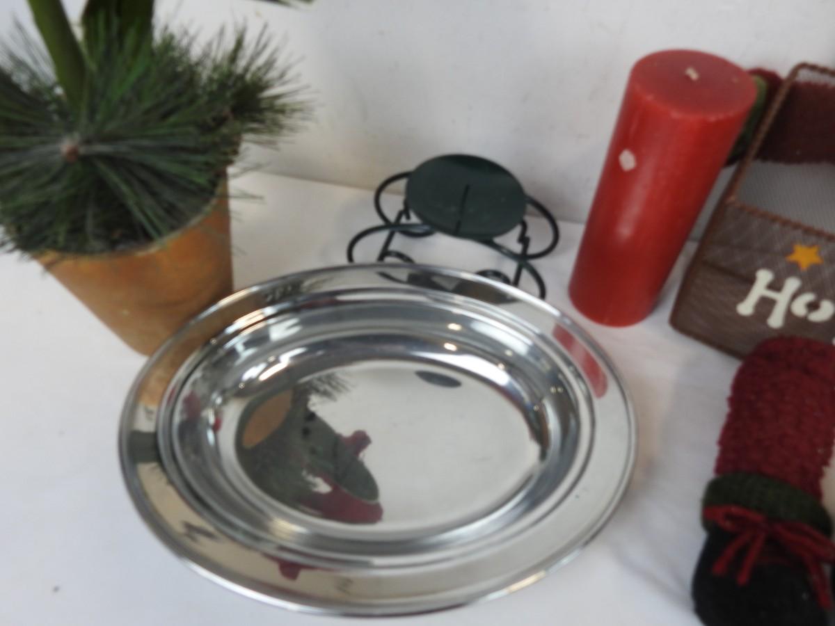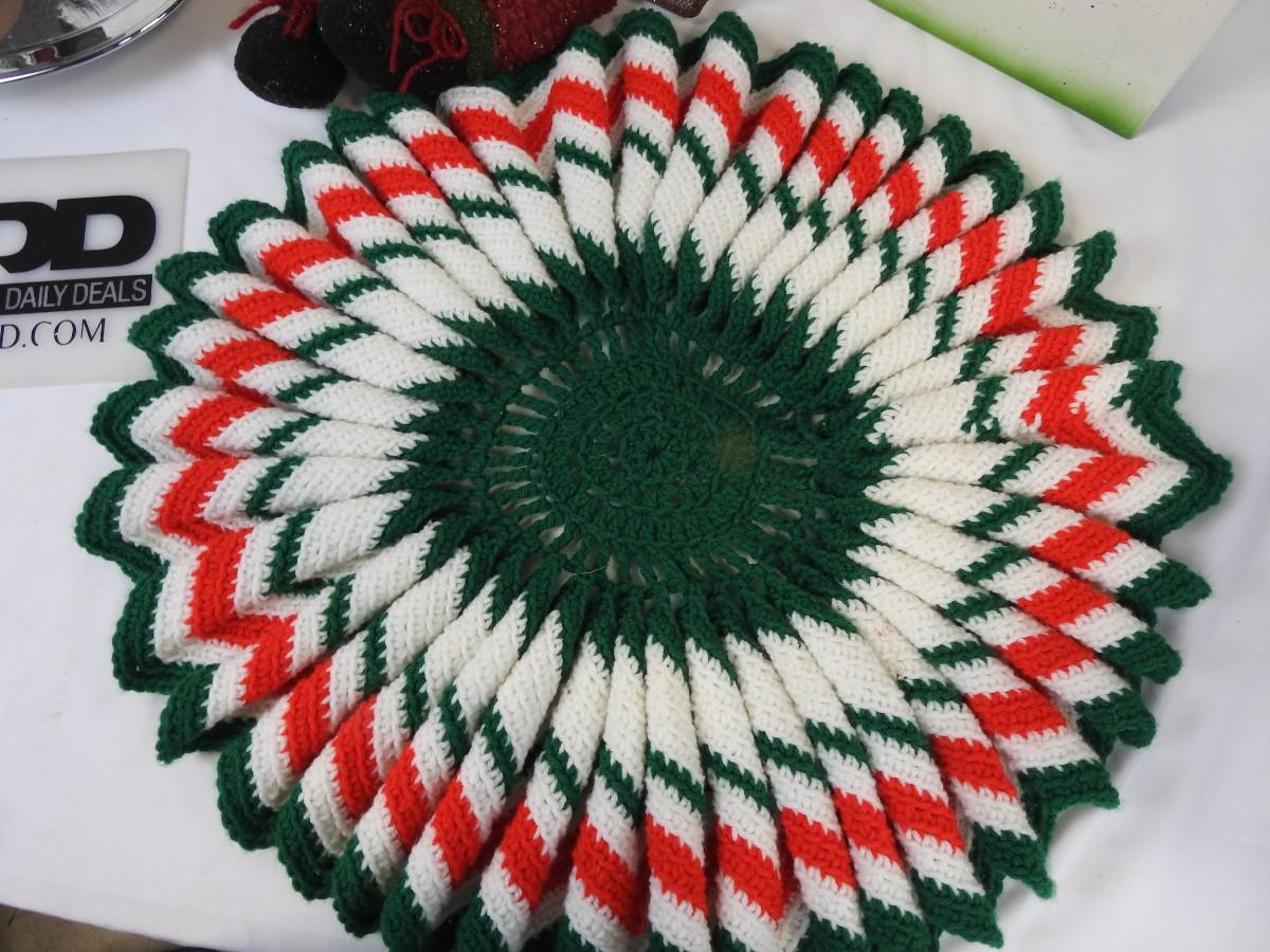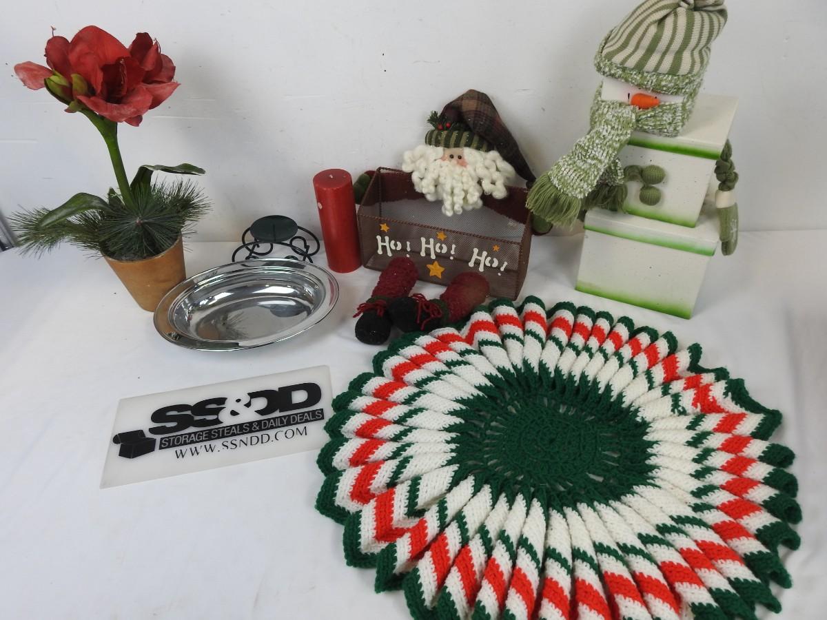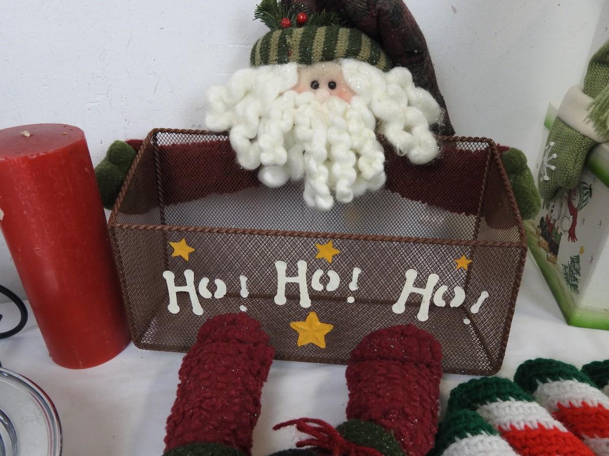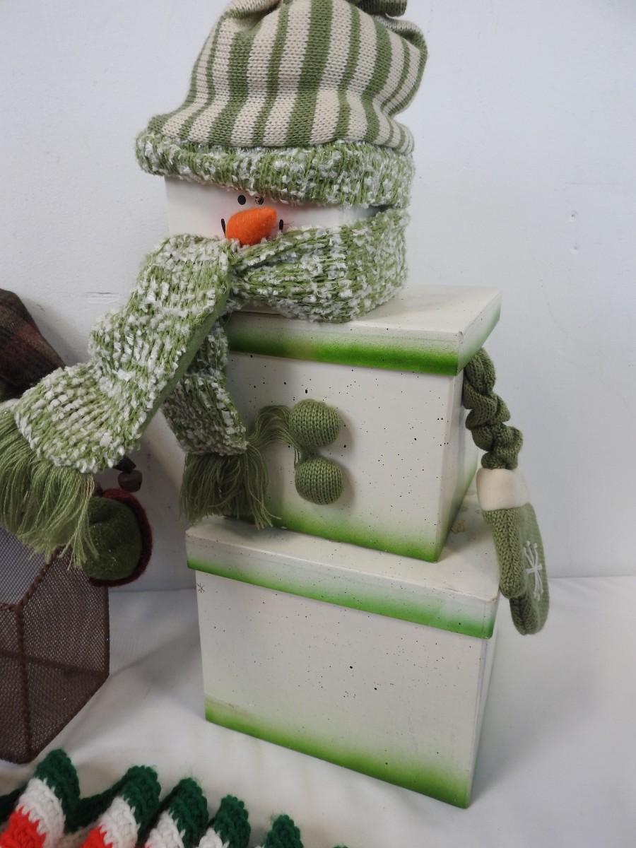 6 pc Christmas: Santa Basket, Snowman Boxes, Knit Doily?