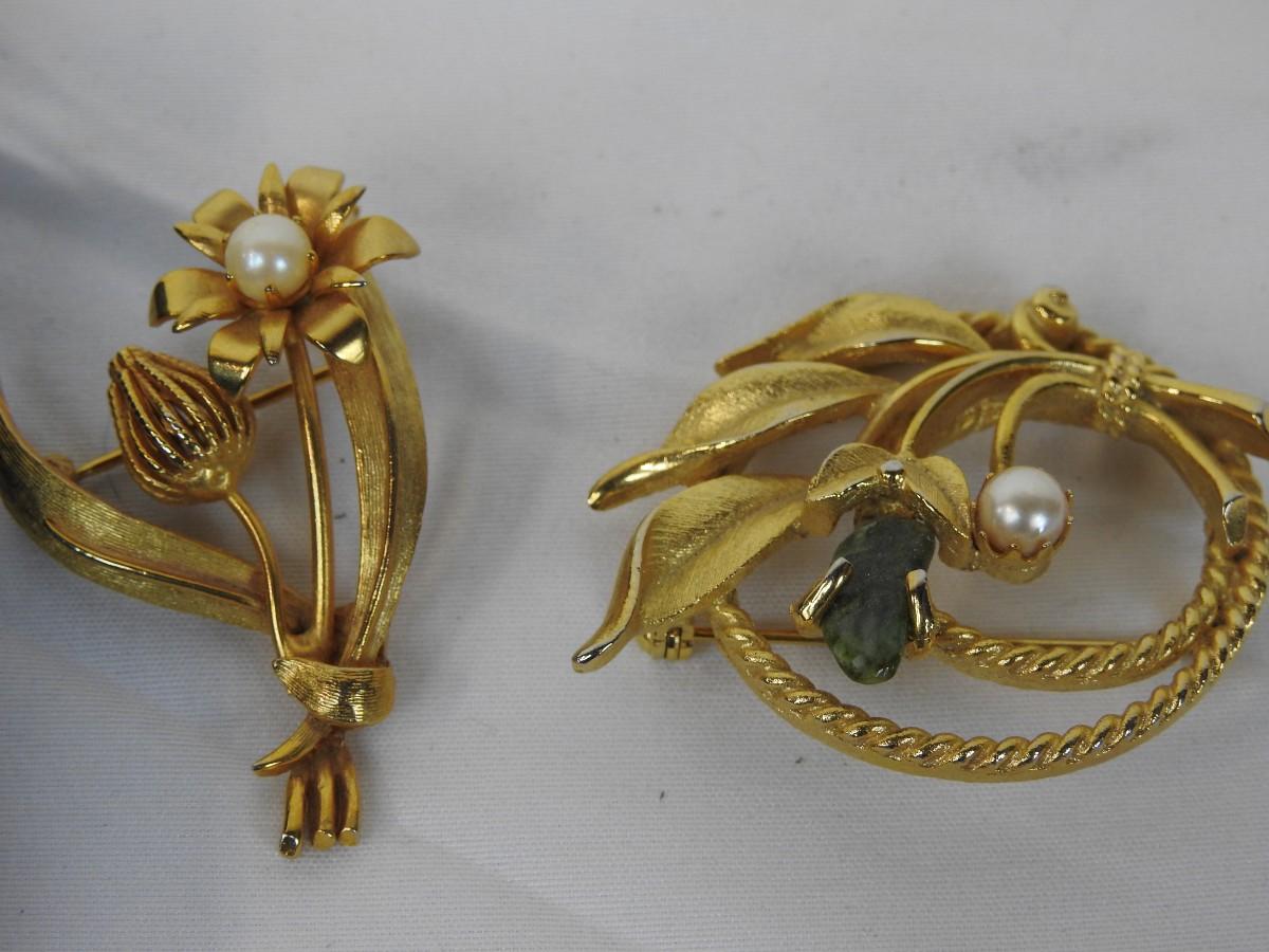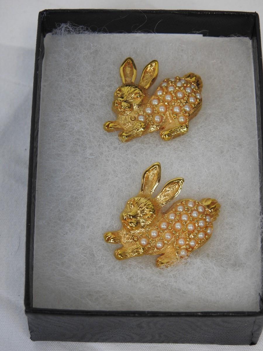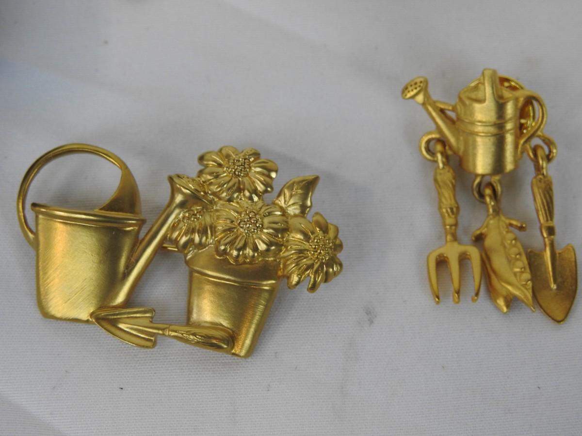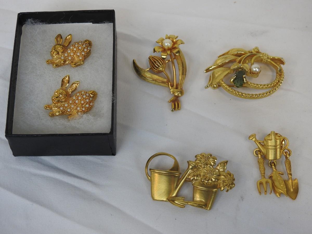 6 pc Costume Jewelry Gold Toned Pins/Brooches: Rabbits, Gardening, Flowers