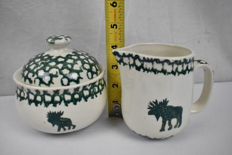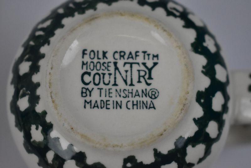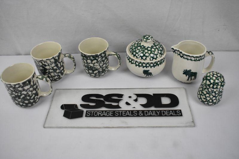 6 pc Cream & Green Dishware: 3 cups, Creamer, Sugar, Shaker, Folk Craft Moose