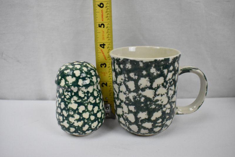 6 pc Cream & Green Dishware: 3 cups, Creamer, Sugar, Shaker by Folk Craft Moose Country by Tienshan (plus 1 more cup not pictured)