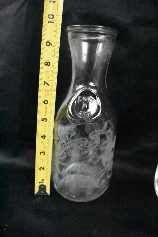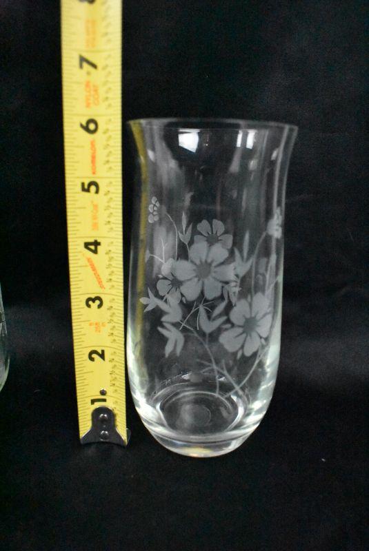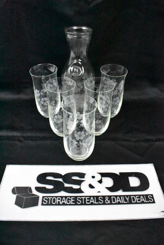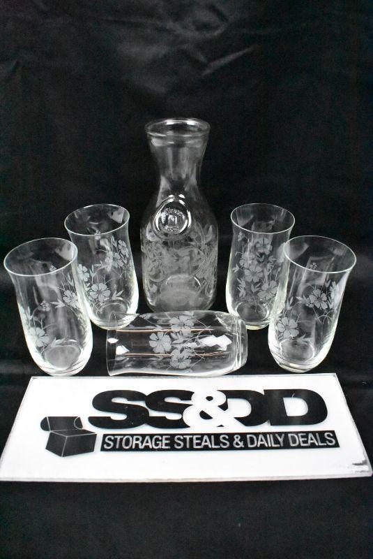 6 pc Drink Set: 5 Floral Etched Glasses, 1 Floral Etched Carafe