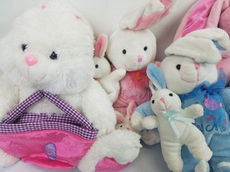 6 pc Easter Bunny Stuffed Animals: 3 white, 1 pink, 1 blue, 1 purple