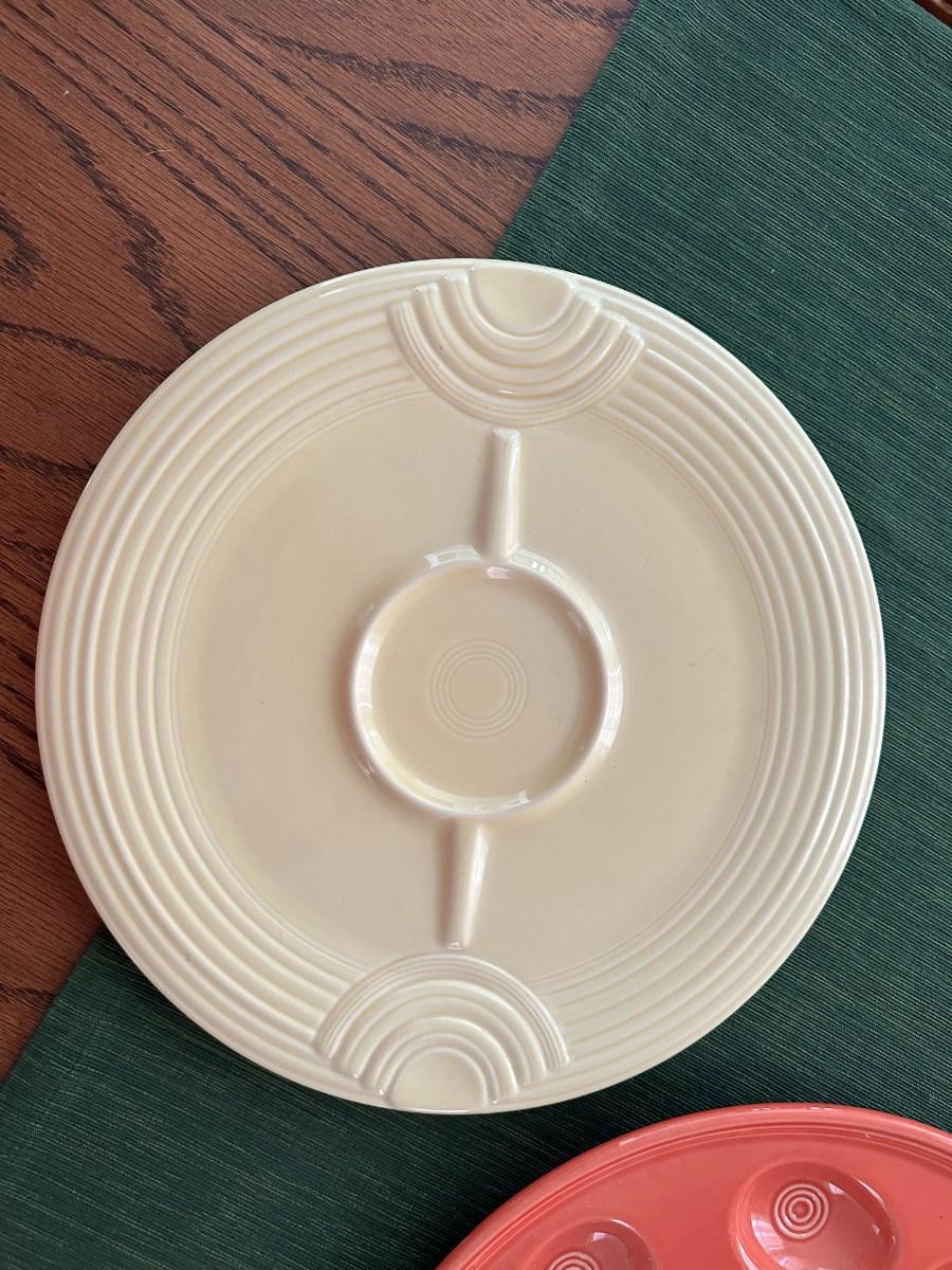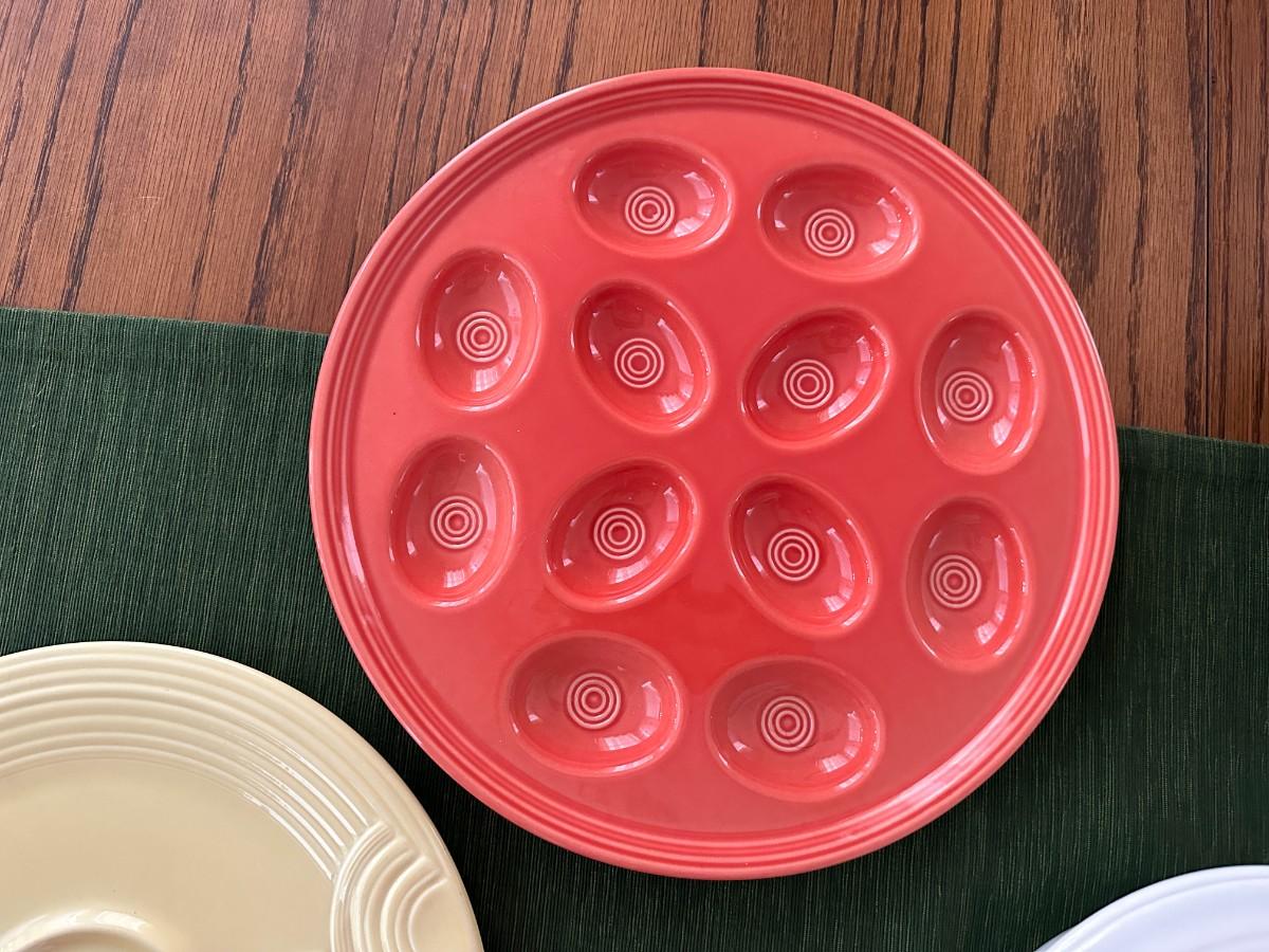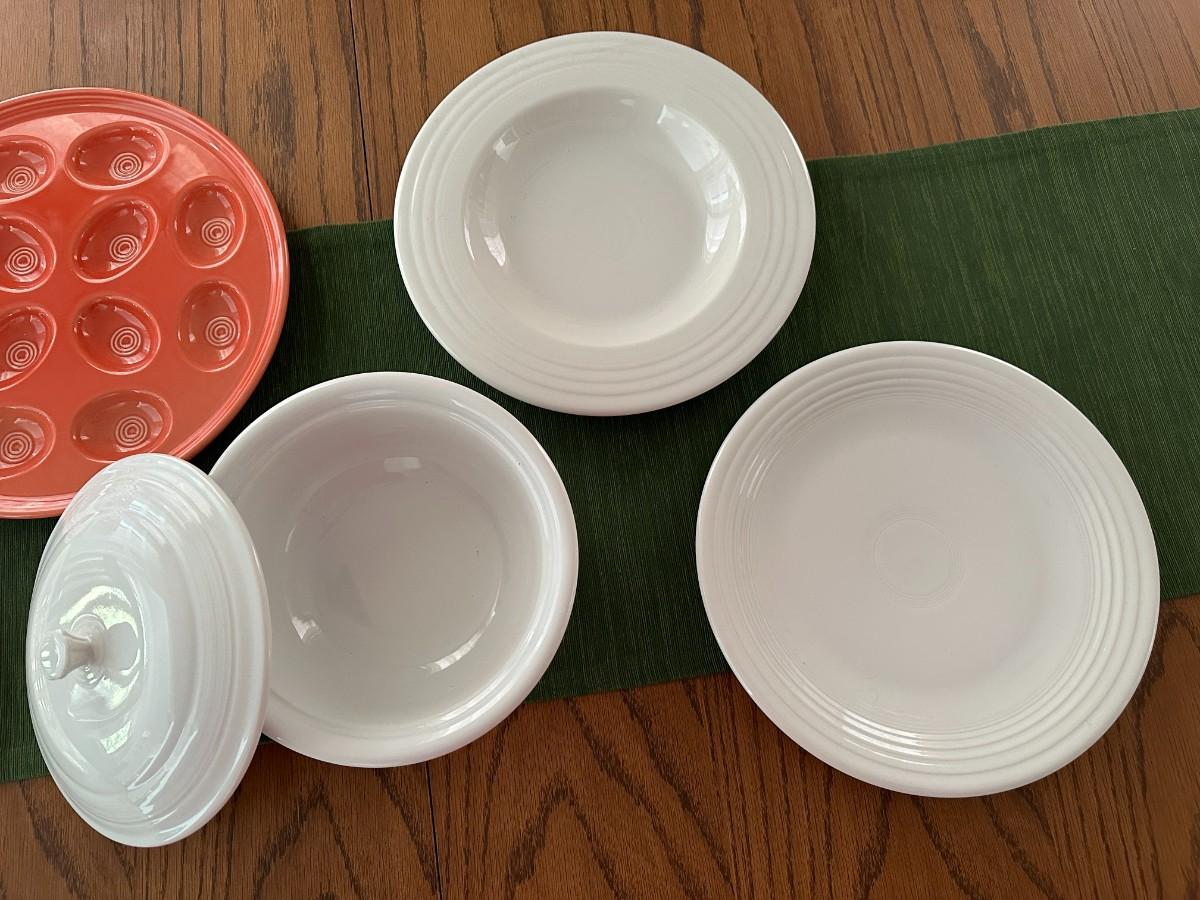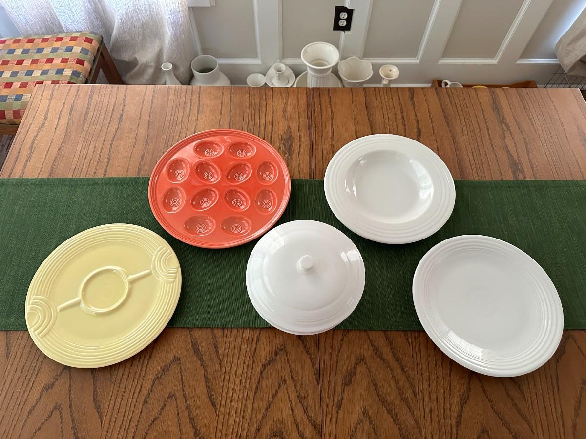 1 Yellow Divided Round Platter, 1 Persimmon Egg Platter, 1 White Serving Bowl, 1 White Round Platter, 1 White Servings Bowl w/1 Lid