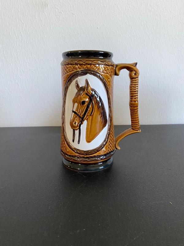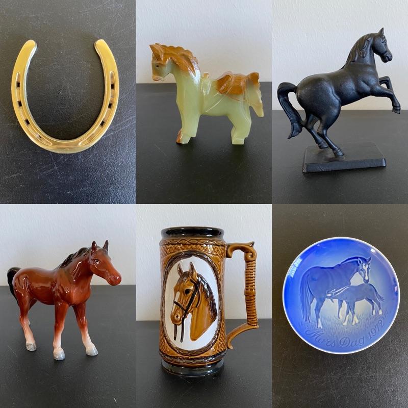 Includes cast iron piggy bank Horse , Horse Pilsner mug , ceramic Brown Horse, hand carved stone horse, mother’s Day Horse Plate- 6” Round / Brass Horse Shoe