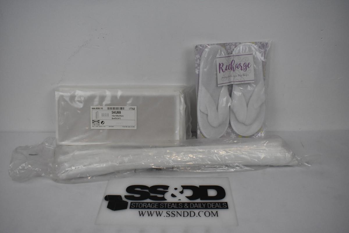 6 pc: Ikea Shoe Organizer, Terry Cloth Flip Flops, 4 Plastic Shoe Horns - New