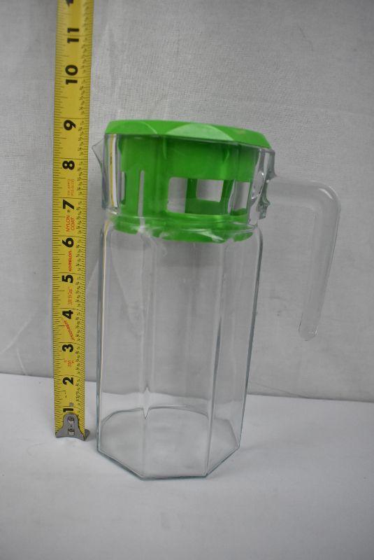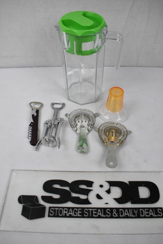 6 pc Kitchen: Glass pitcher (green plastic lid) & 4 cocktail accessories (openers & strainers)