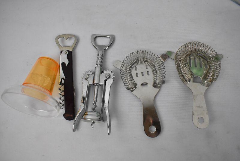 6 pc Kitchen: Glass pitcher & 4 cocktail accessories (openers & strainers)