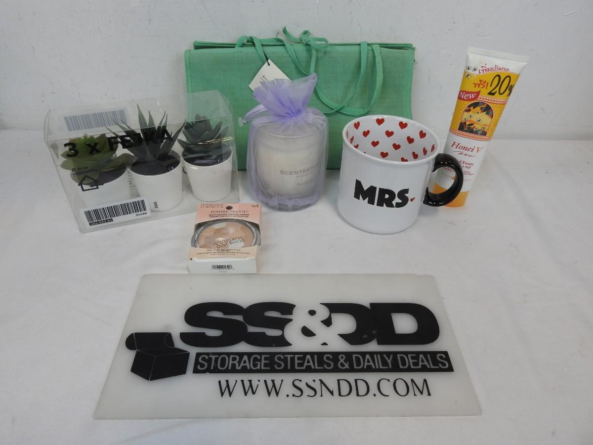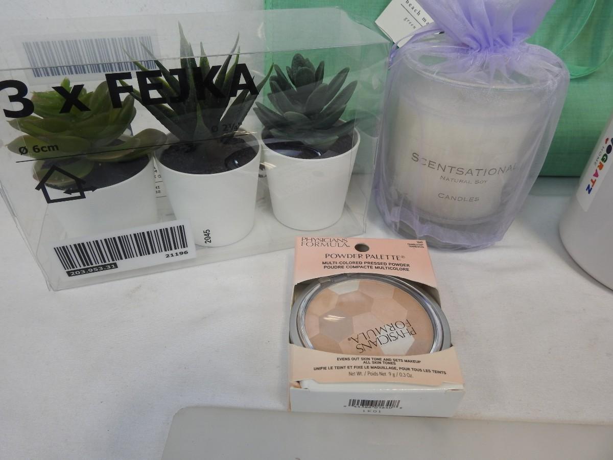 6 pc Personal Care: Beach Mat, Mug, Face Scrub, Faux Plants, Candle, Pressed Powder - New