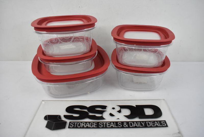 6 pc Rubbermaid Containers plus 6 red lids (qty 3 Five Cups, qty 1 Three Cups, Qty 1 Nine Cups, qty 1 Two Cups)