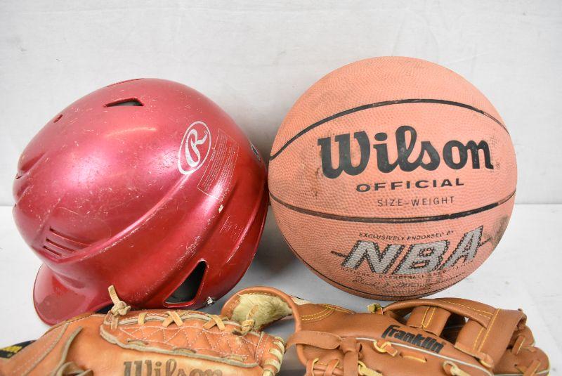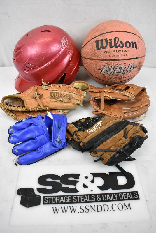 6 pc Sports: Basketball, Baseball Helmet, 4 misc Baseball Gloves