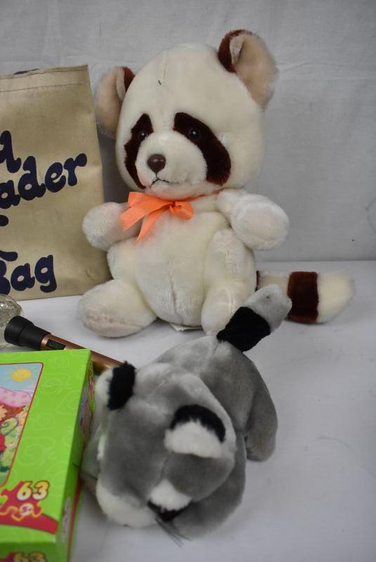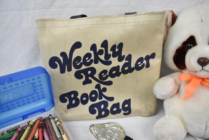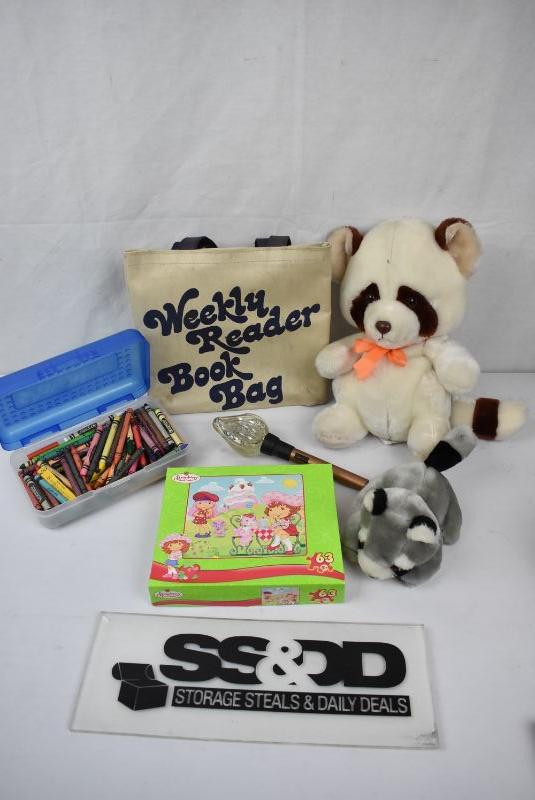 6 pc Various Kids Toys: Book Bag, 2 Stuffed animals, Crayons, Puzzle (complete) Glitter wand.