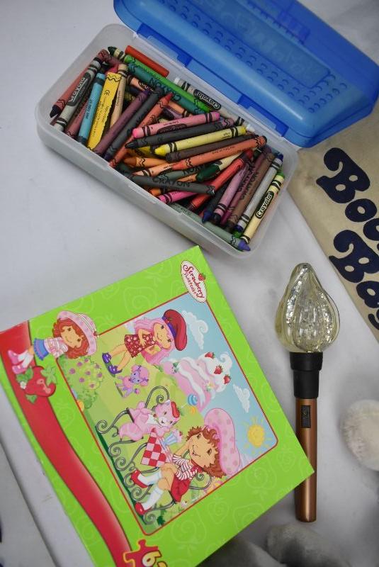 6 pc Various Kids Toys: Book Bag, Stuffed Animals, Crayons, Puzzle, Glitter Wand
