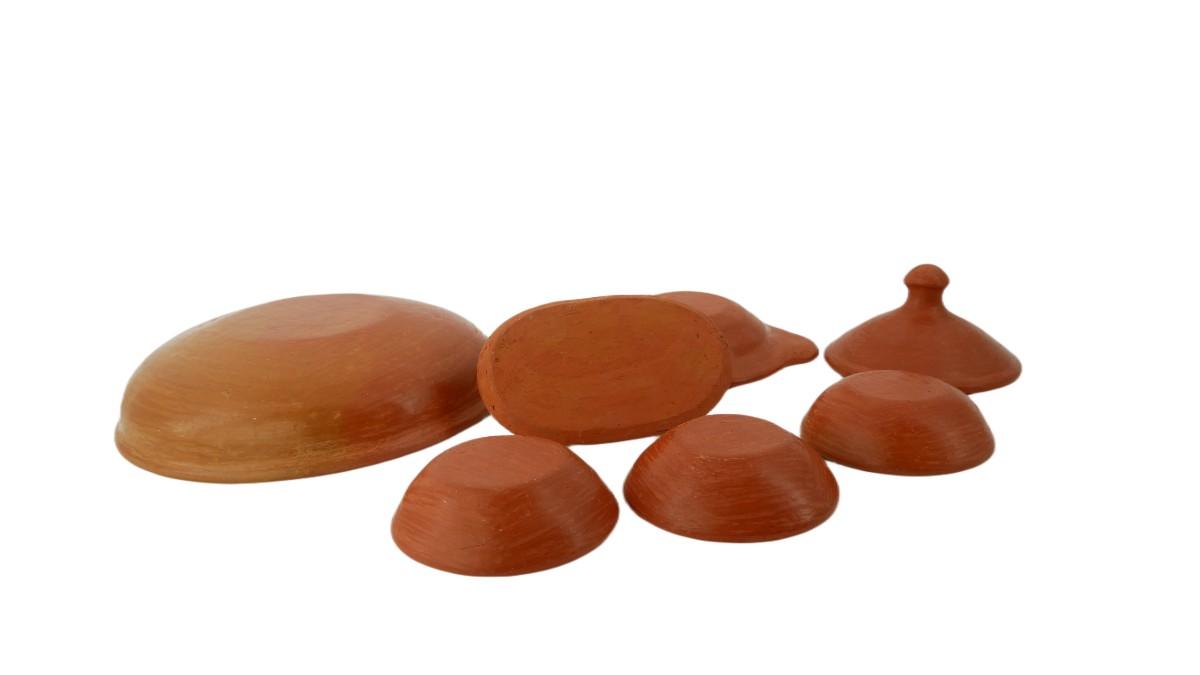 Six piece primitive style handcrafted and handmade red clay serving and spice bowls. Unmarked, unsigned. Serving bowl measures W 9" x H 2". Small spice bowl (x3) measures W 4" x H 1.5". Salt and pepper tray measures L 5" x H 2.25" x W 3". Lidded bowl measures W 7.5" x H 4.5". Packaged weight is 6 lbs. (D8)