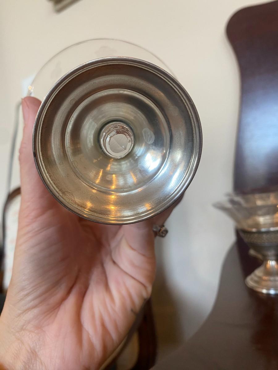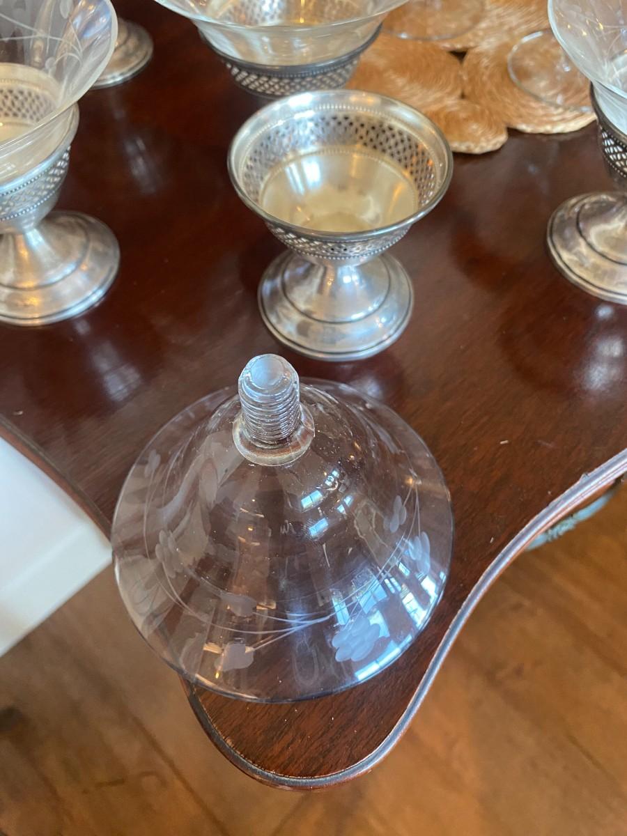 6 Pcs Silver and Crystal Champagne-Coup Glass screws into silver base.  (One chipped on the rim)