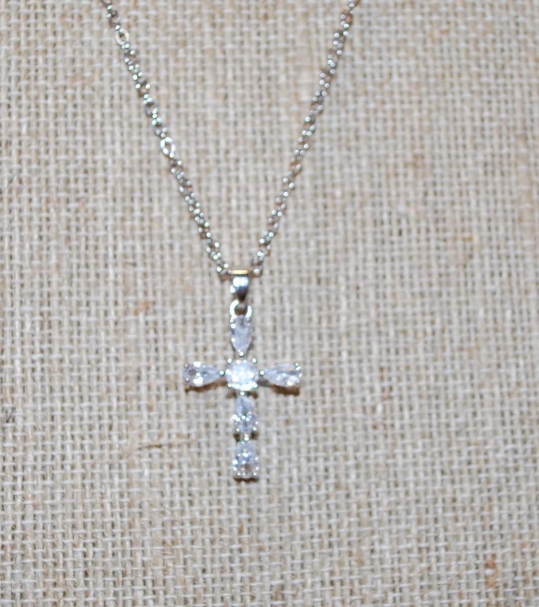 6 Pear Shaped Clear Stones Cross PENDANT (1" x ¾") on a Silver Tone Necklace Chain 17" L