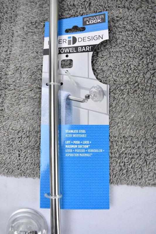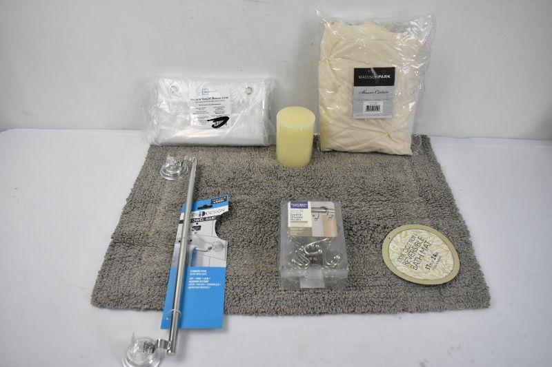 6 Piece Bathroom Decor Set: Shower Curtain, Rug, Curtain Liner, Curtain Hooks, Towel Bar, & Candle - New