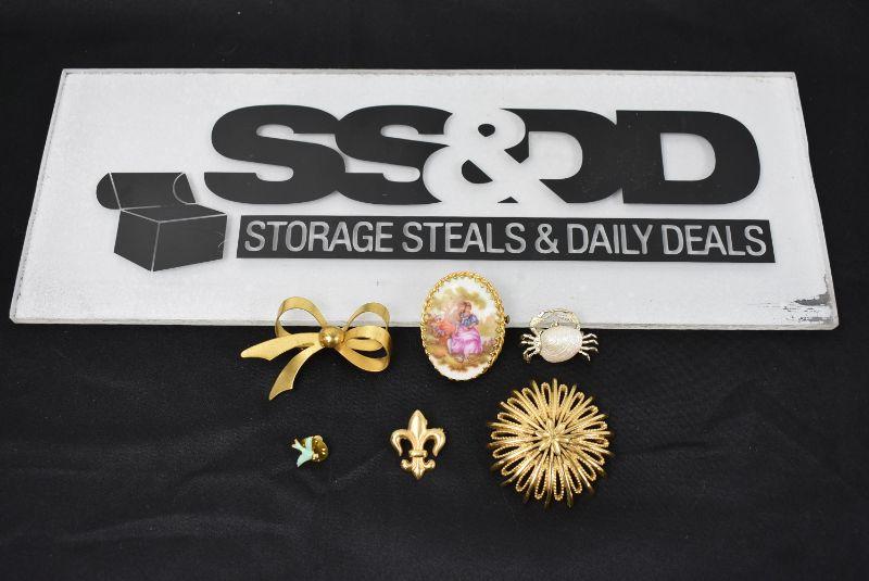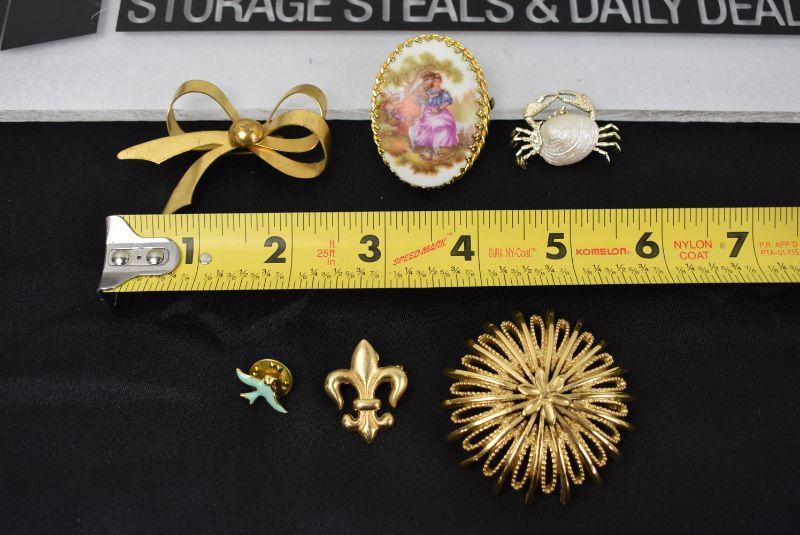 6 Piece Costume Jewelry Pins, Gold Tones - Vintage