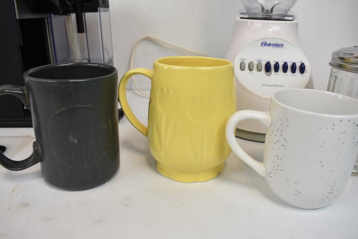 6 Piece Kitchen Lot, Delonghi Coffee Maker, Osterizer Blender, 3 Mugs