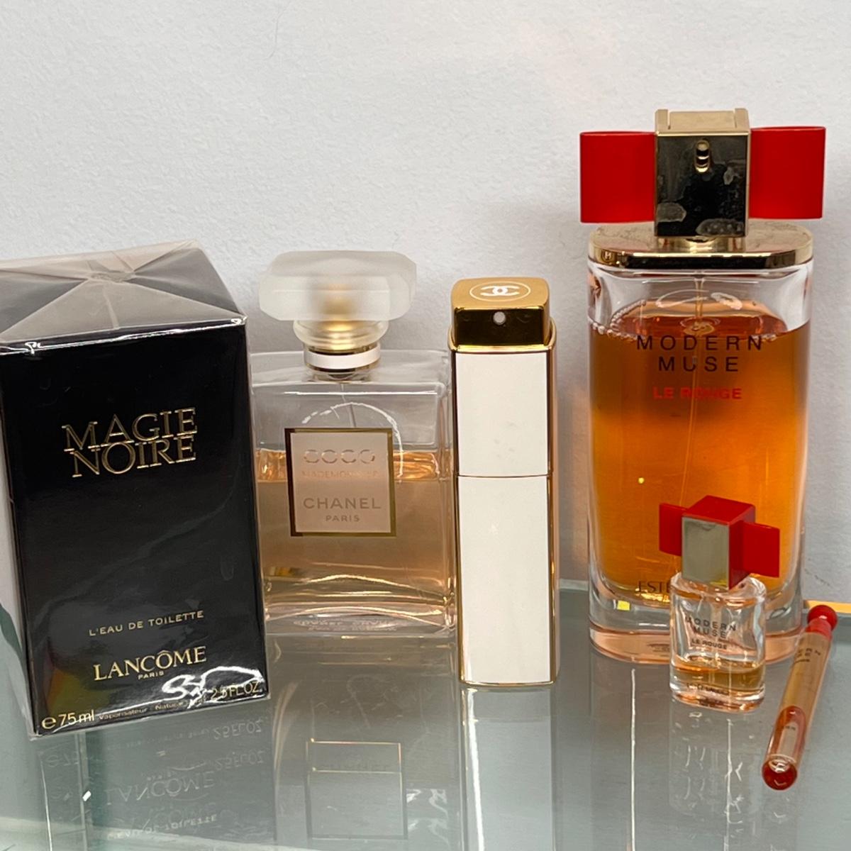 AS IS. Magic Noire new sealed 2.5 fl. Chanel mademoiselle and Modern Muse Le Rouge Estée Lauder have all been used as shown in the photos.
