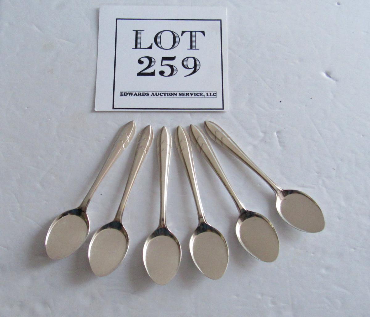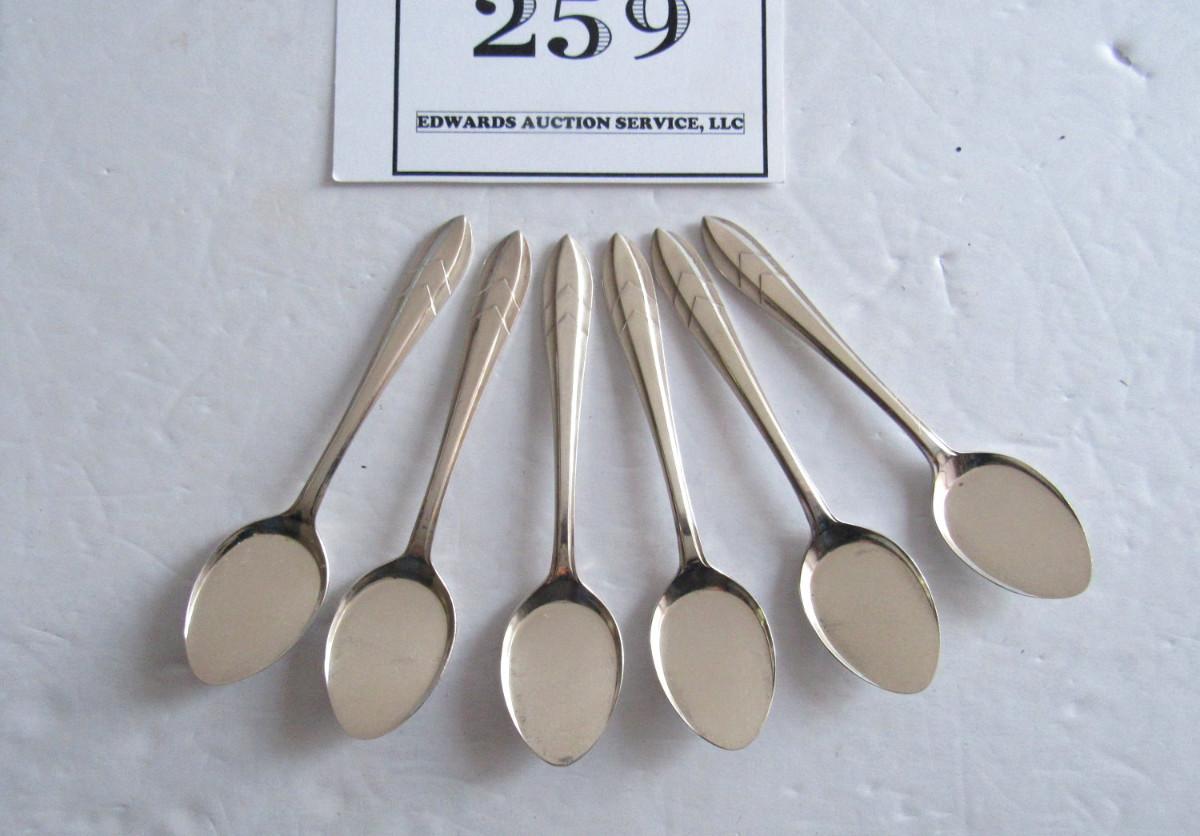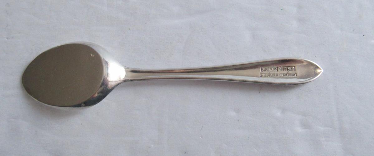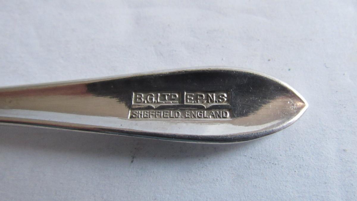 Nice condition. From an internet search I found a set like this with original advertising calling these ice cream spoons. Marked Sheffield England. Shipping available at actual cost plus $5.00 handling/supply fee per box. See our terms for details. All sales final.