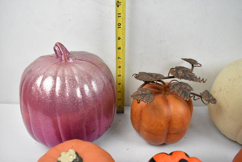 6 Piece Pumpkin Lot: Pink, Cream, and Orange are Plastic, Checkered One is Glass