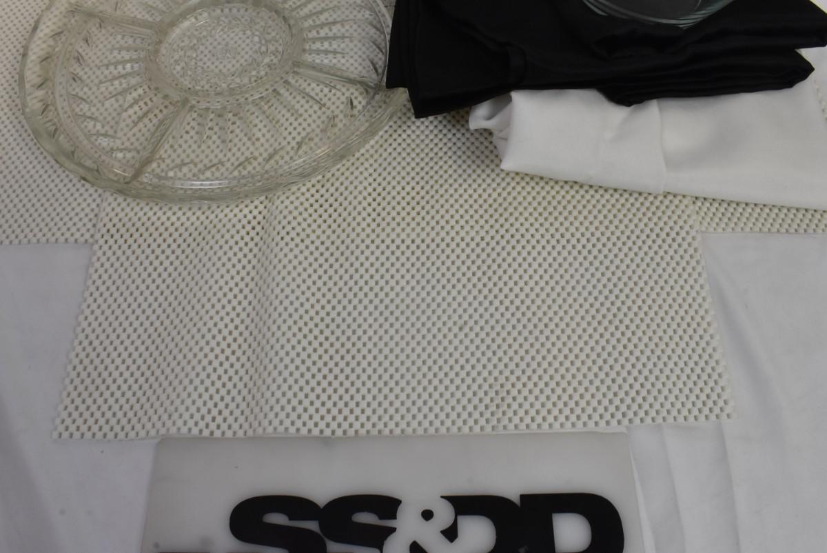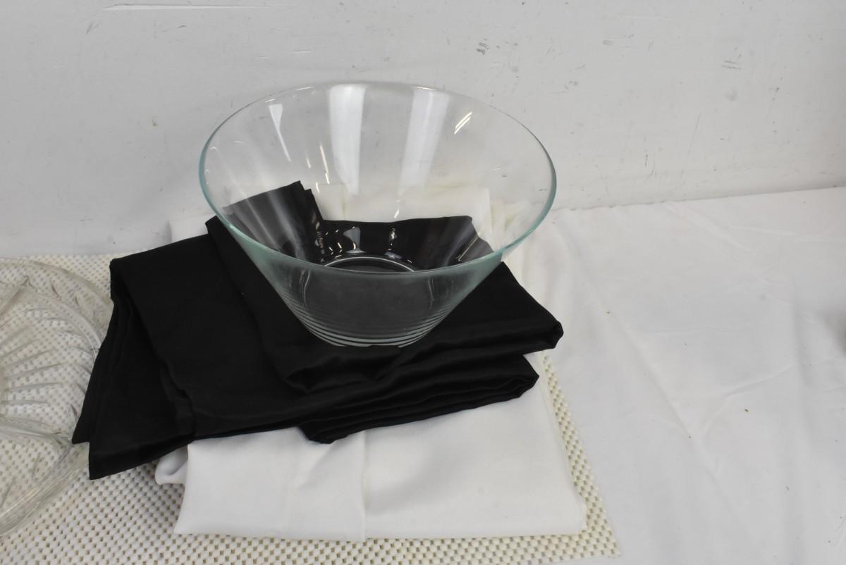 6 Piece Table Decorations: Tablecloths, Glass Bowl, Glass Serving Plate, Tablecloth Holders