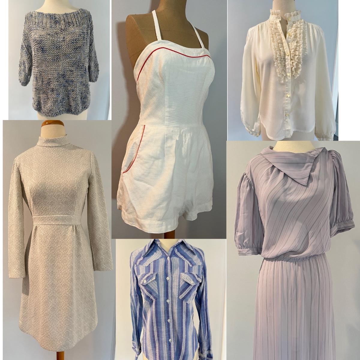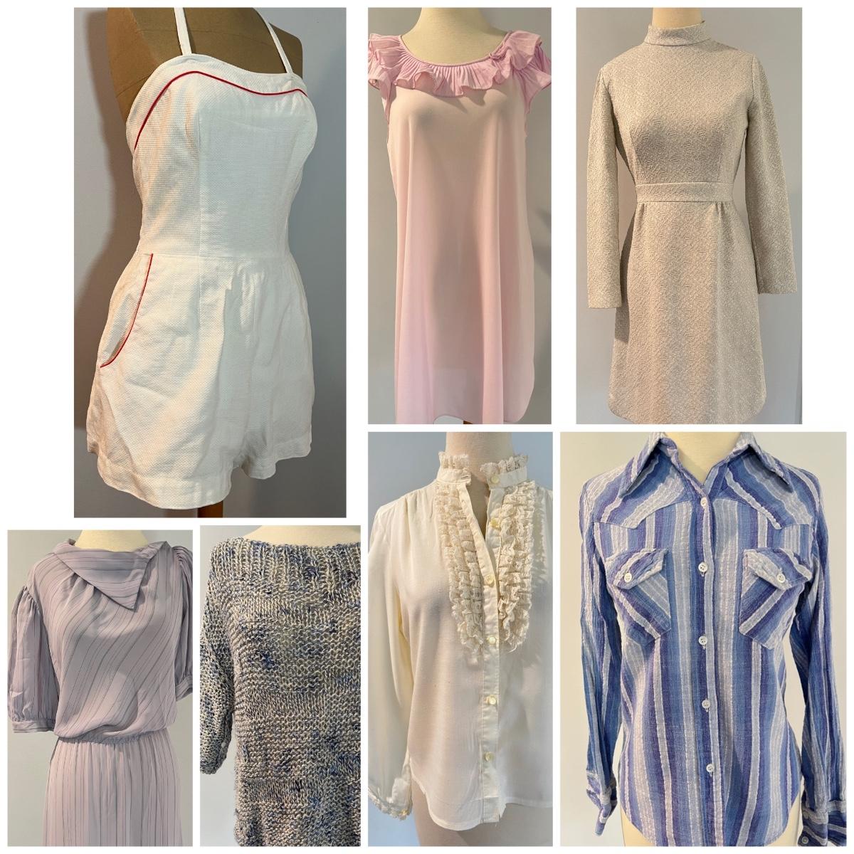 Amazing 50’s romper, 80’s dress plus 70’s and 80’s tops. Various eras, sizes and conditions.