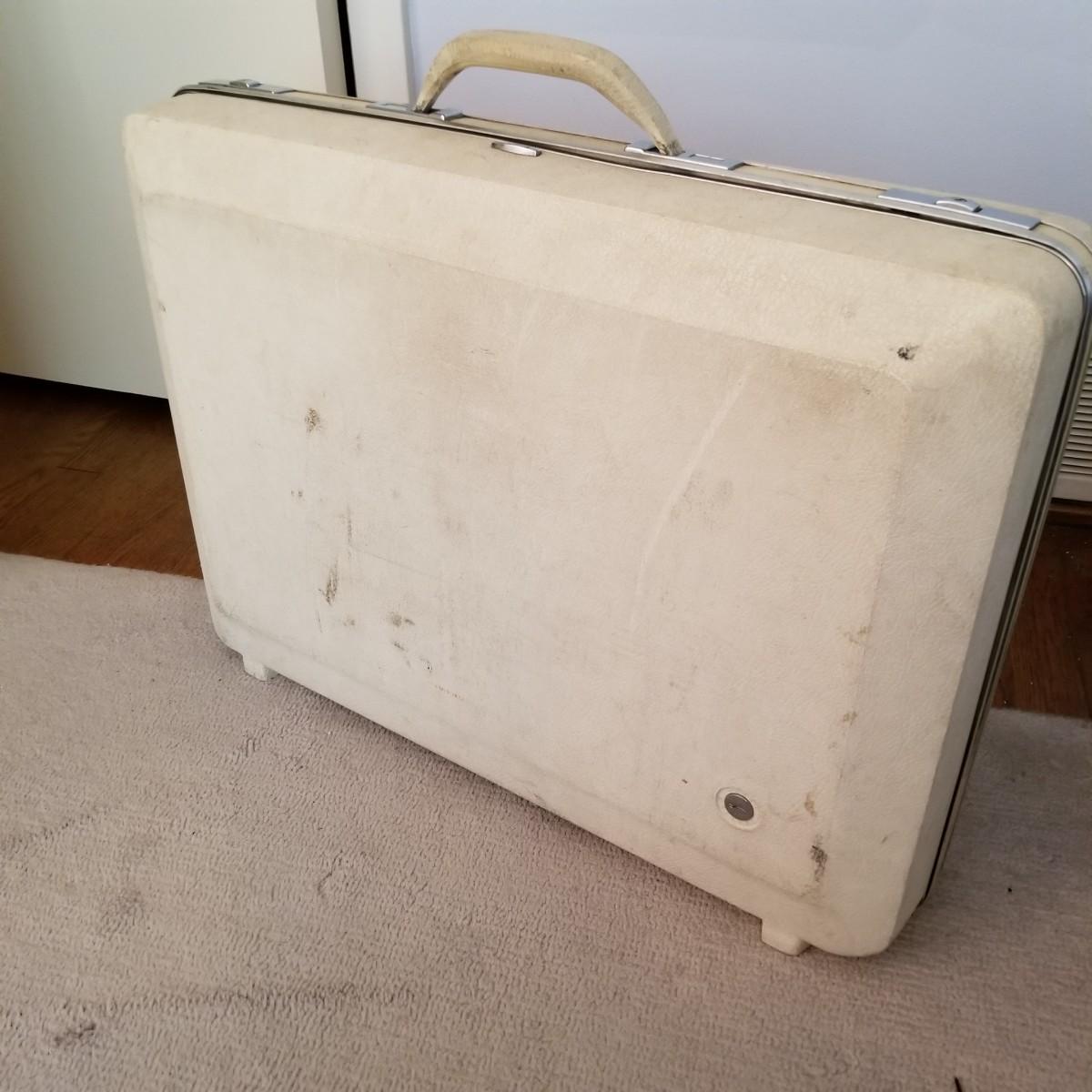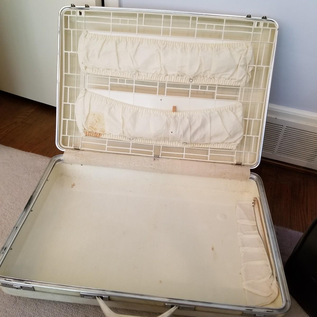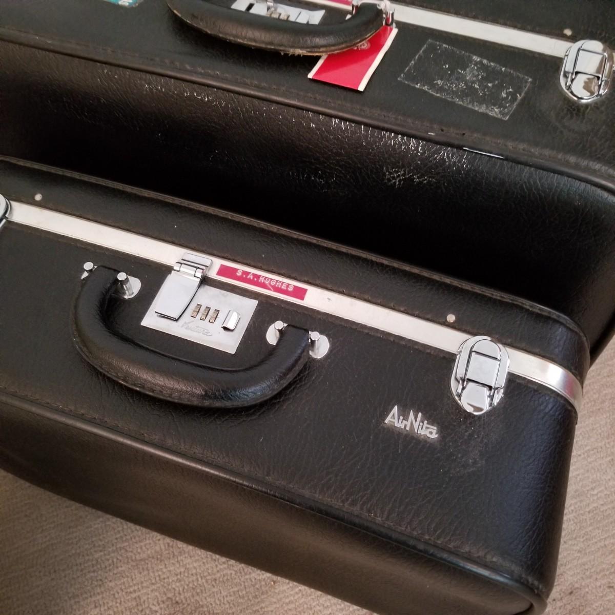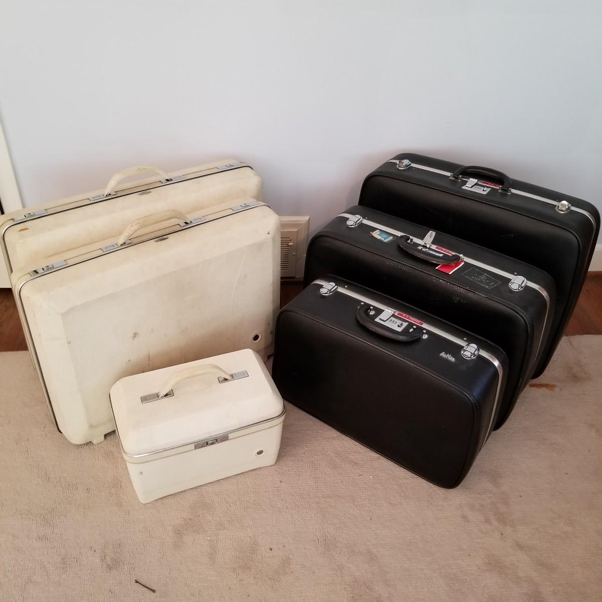 Two sets of luggage: three white pieces, three black pieces of luggage. White set is made by Sears, has hard plastic outershells. Largest piece is 28" x 21" x 8". One large, one medium and one cosmetic case. Black set is by Ventura, has combination locks and vinyl outer covering. Largest suitcase is 24" x 20" x 8", but is unable to open due to lack of combination. Other two black cases open fine. Some discoloring inside and out, see photos. Local pickup only.