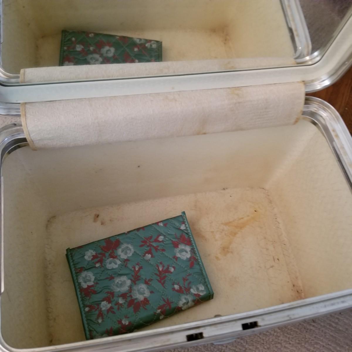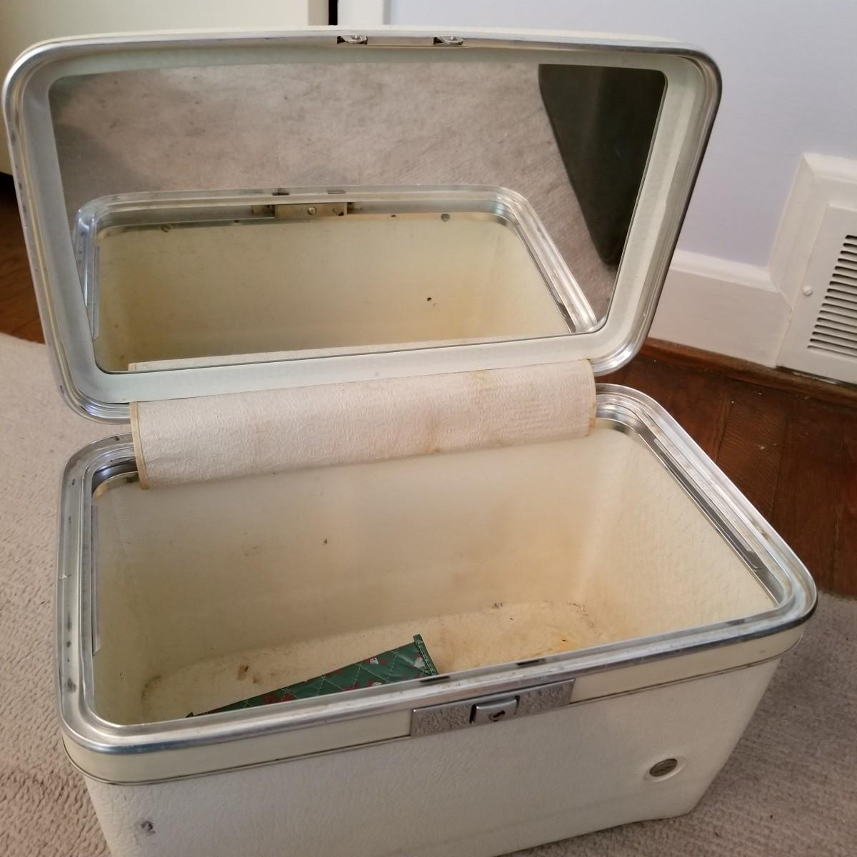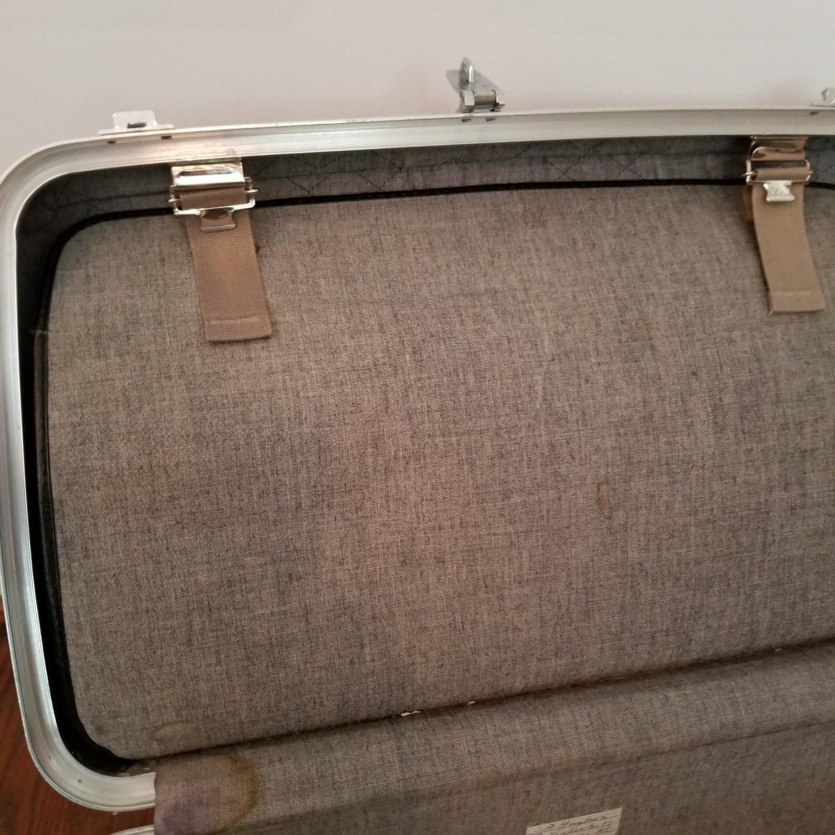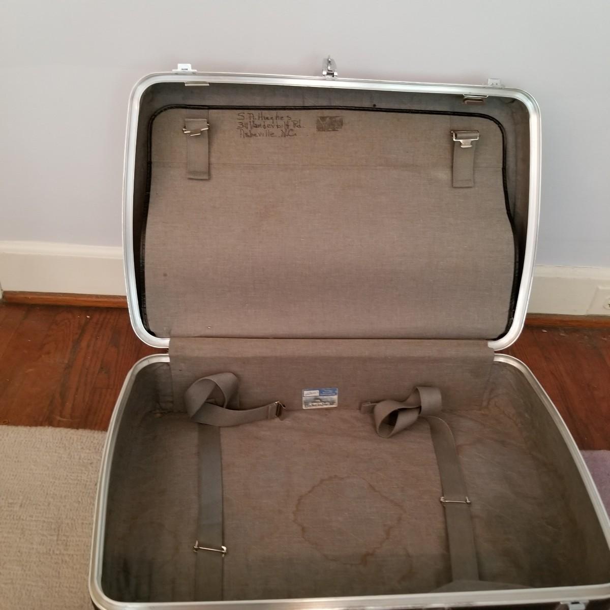 Two sets of luggage: three white pieces, three black pieces of luggage. White set is made by Sears, has hard plastic outershells. Largest piece is 28" x 21" x 8". One large, one medium and one cosmetic case. Black set is by Ventura, has combination locks and vinyl outer covering. Largest suitcase is 24" x 20" x 8", but is unable to open due to lack of combination. Other two black cases open fine. Some discoloring inside and out, see photos. Local pickup only.