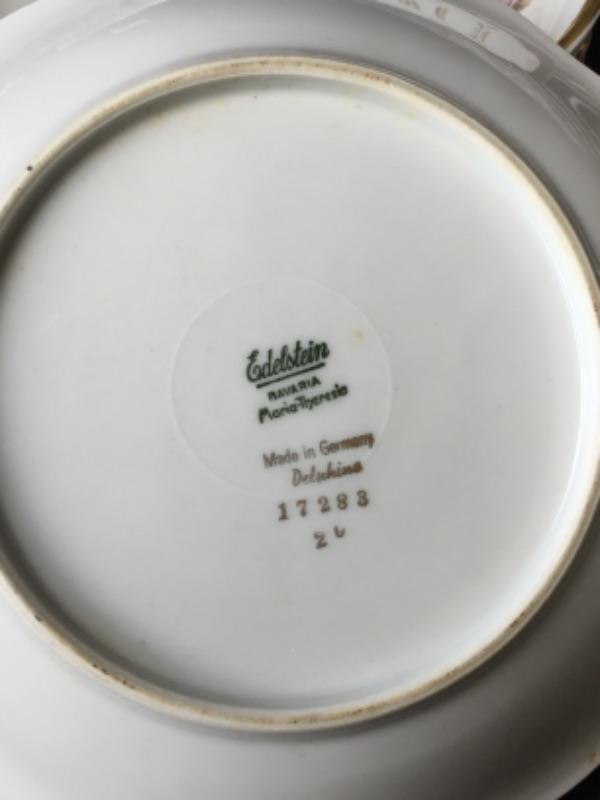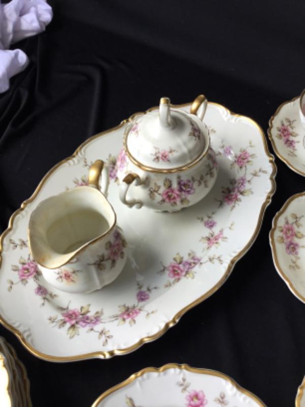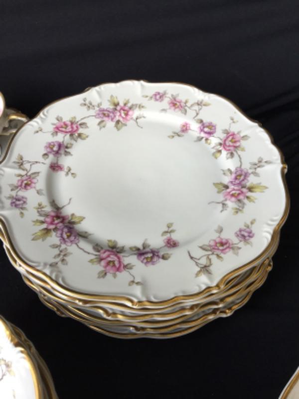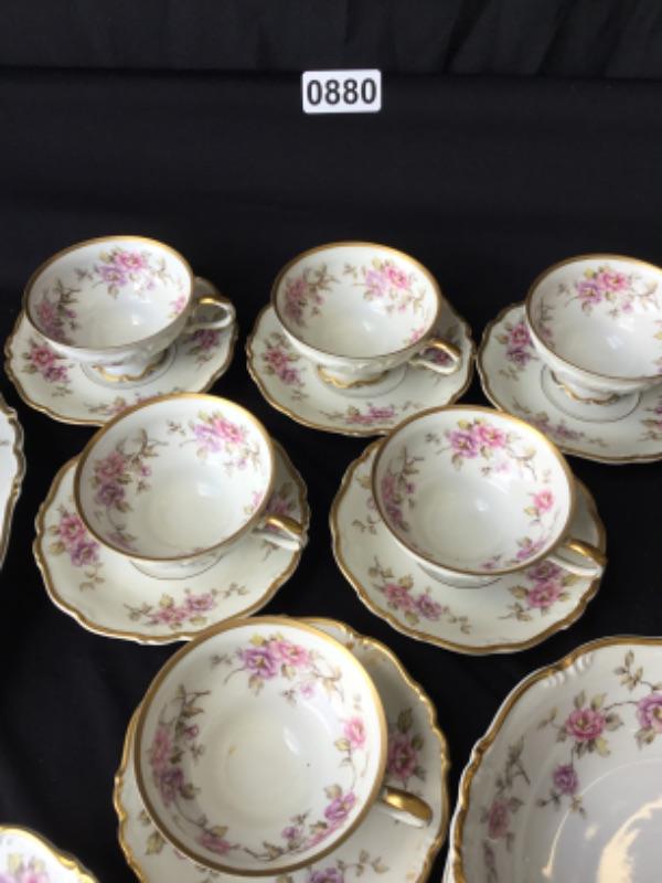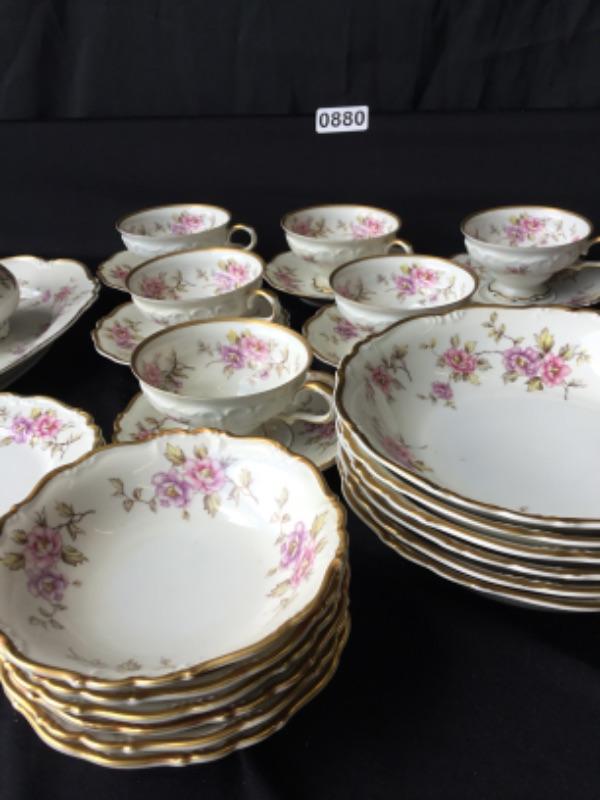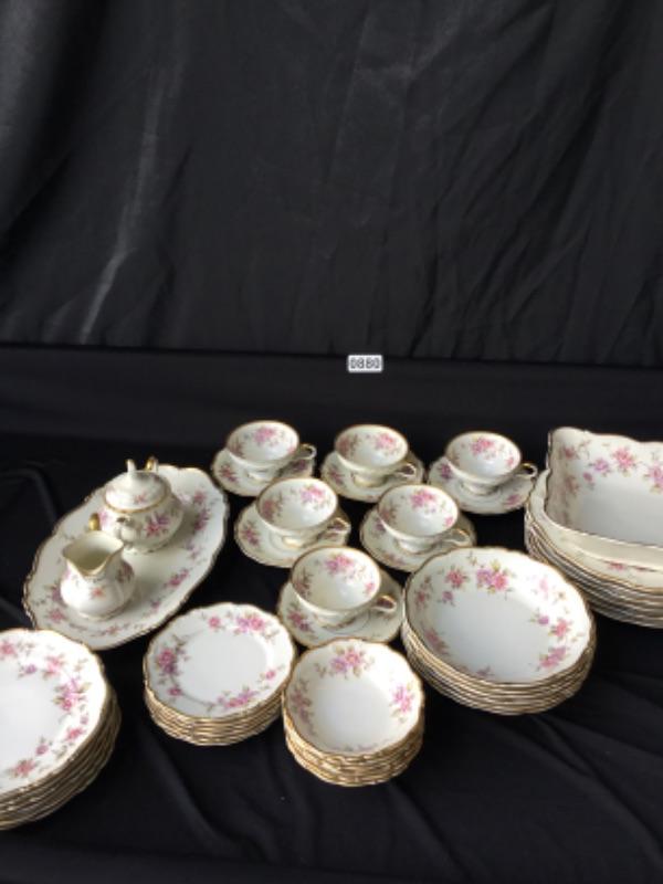 6 placesetting China, dinner plates, salad plates, dessert plates, salad bowls, dessert bowls, coffee cup and saucers, cream and sugar, platter, serving bowl lot 880