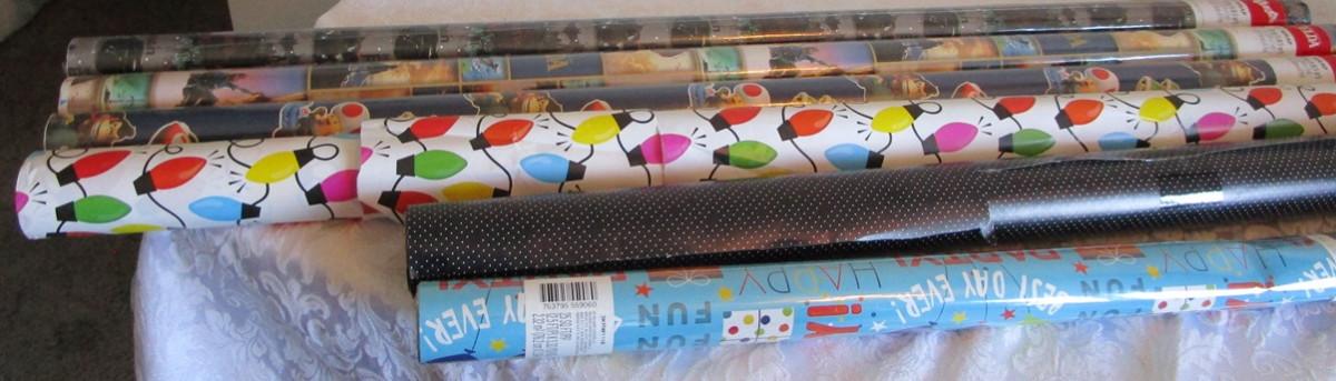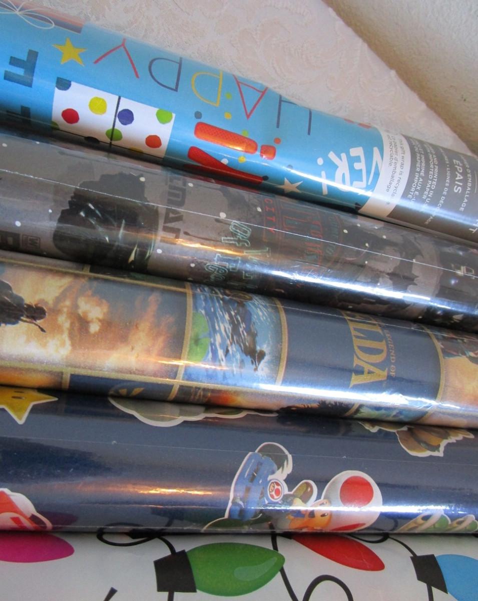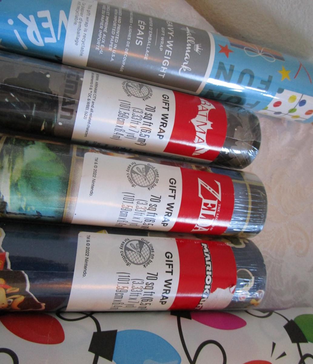 4 new in package, 1 birthday, Batman, Legends of Zelda, and Mario Kart, one Christmas, one black with white dots. 4 rolls are 40", 2 rolls are 30", see pictures