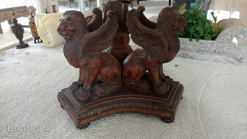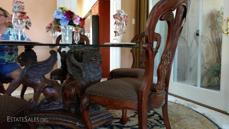 Glass-topped Round Dining Table, carved wood pedistal with six chairs