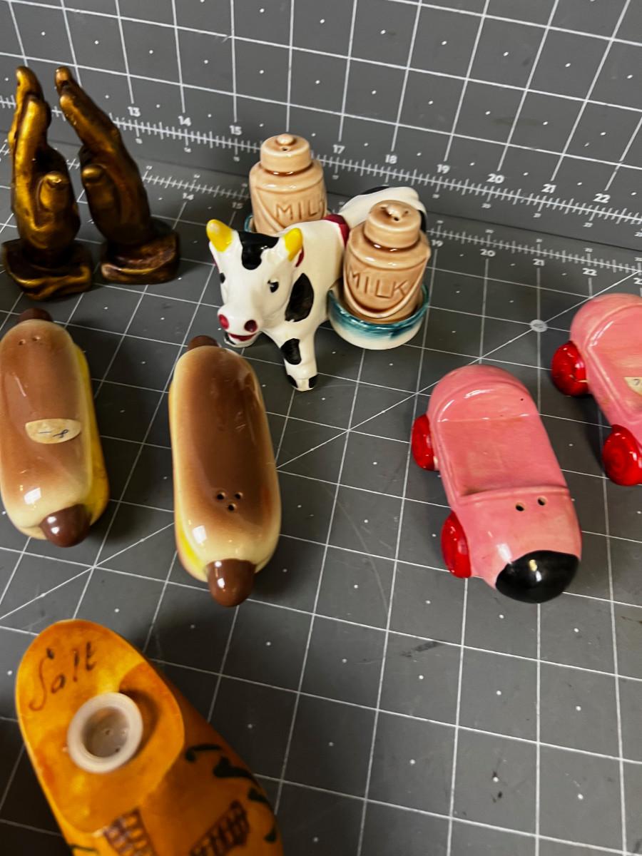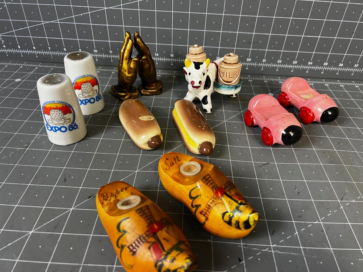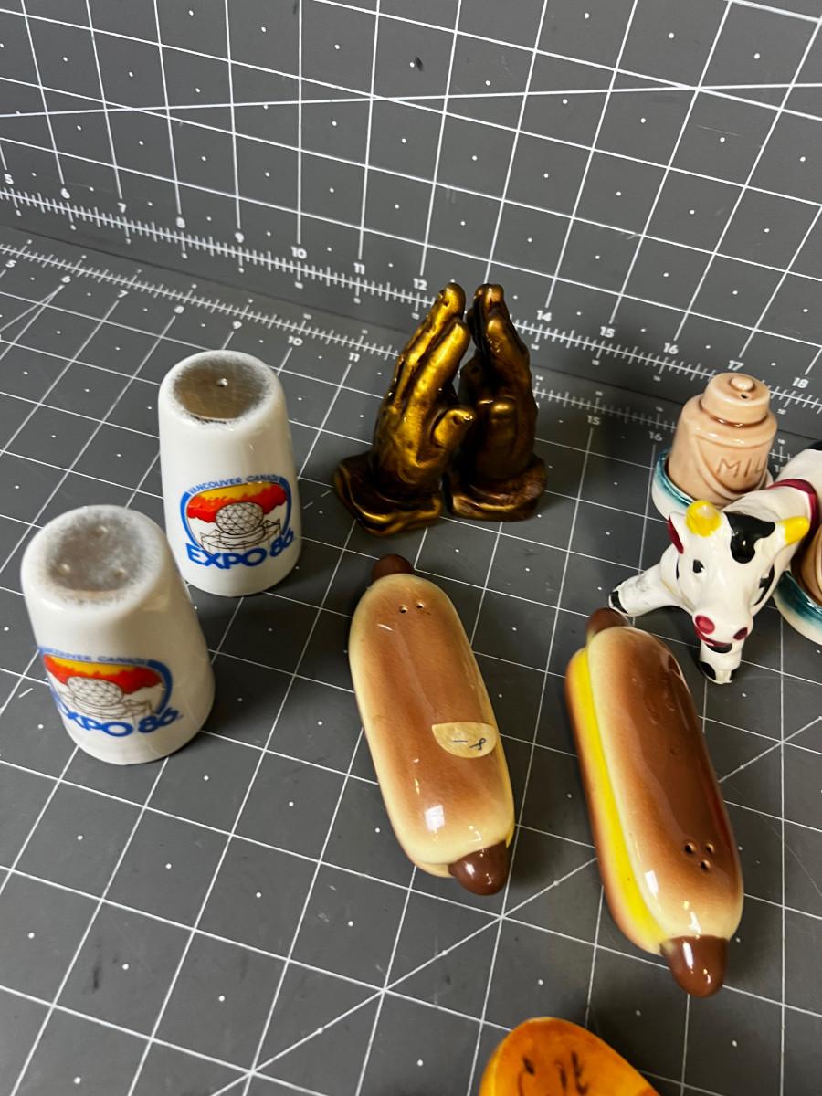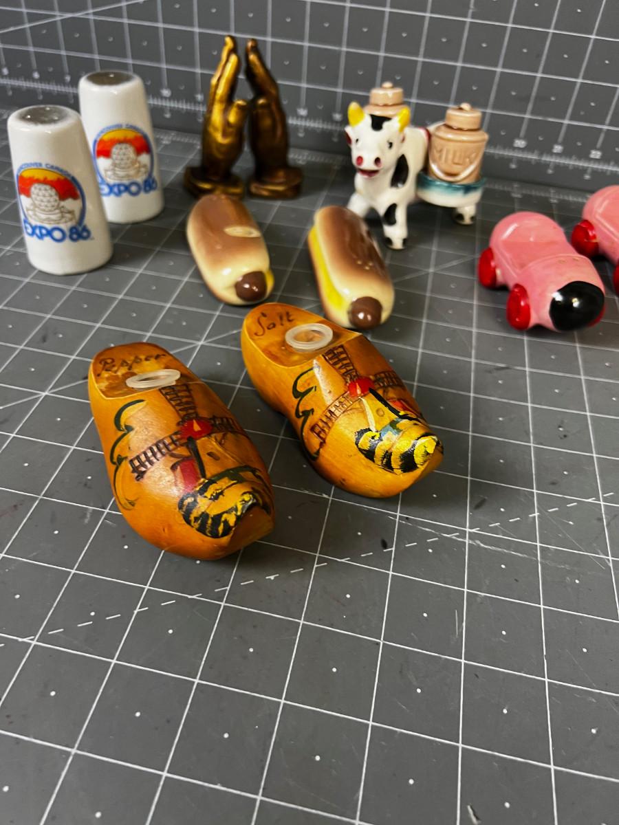 6 Sets of Vintage Salt & Peppers Hot Dogs, Praying Hands, Wooden Shoes