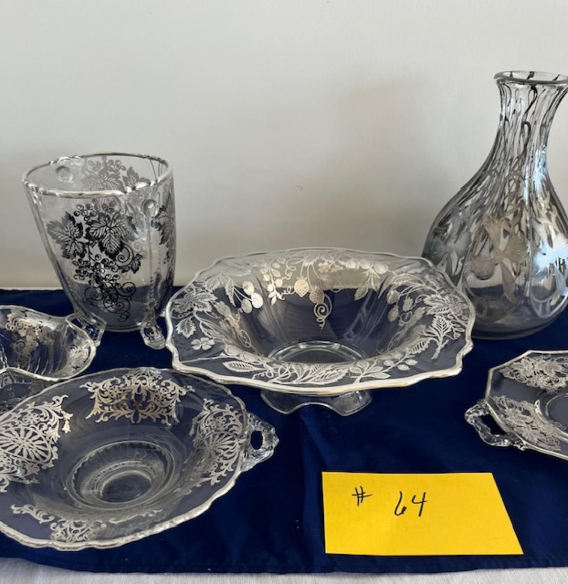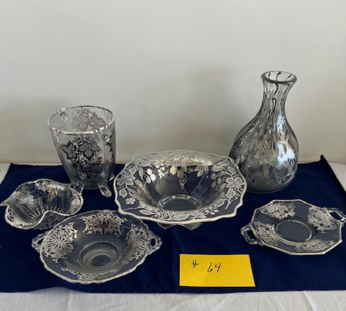 Silver overlay ice bucket vase, 2 bowls, bonbon, plate