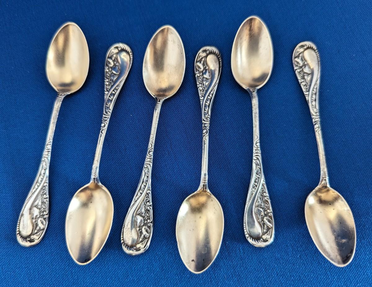 6 (six) Art Nouveau floral motif Wood & Hughes Sterling silver demitasse spoons, gold wash bowls