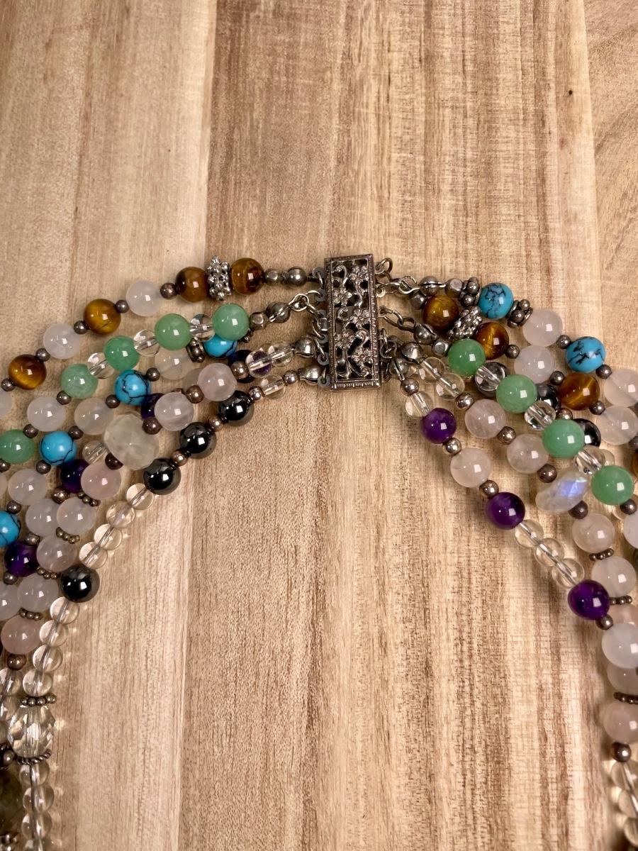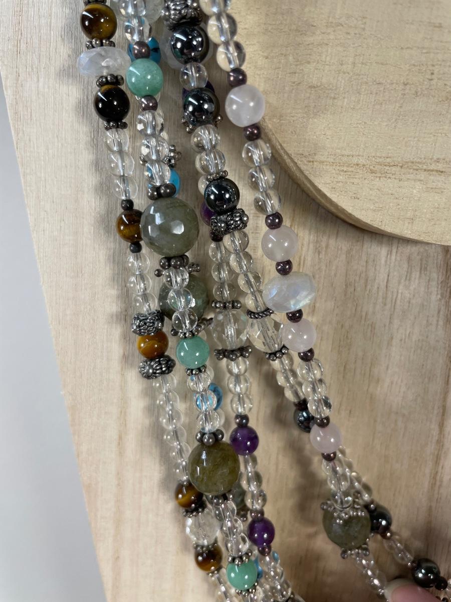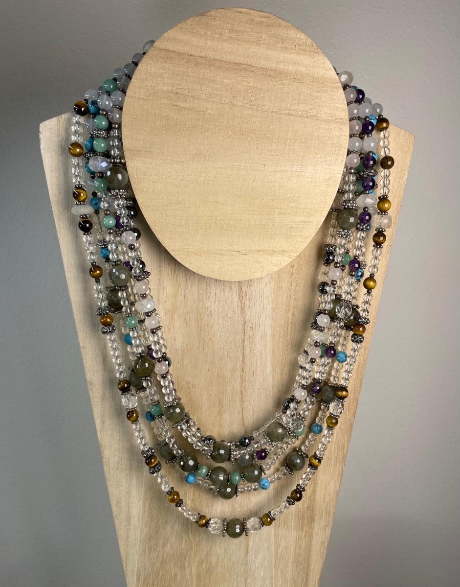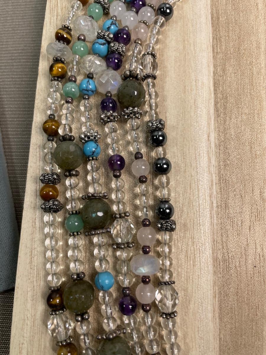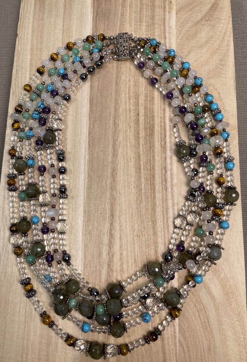 Great piece with labradorite, tiger eye, howlite, rose quartz and amazonite beads. Push clasp. Up to 24” long