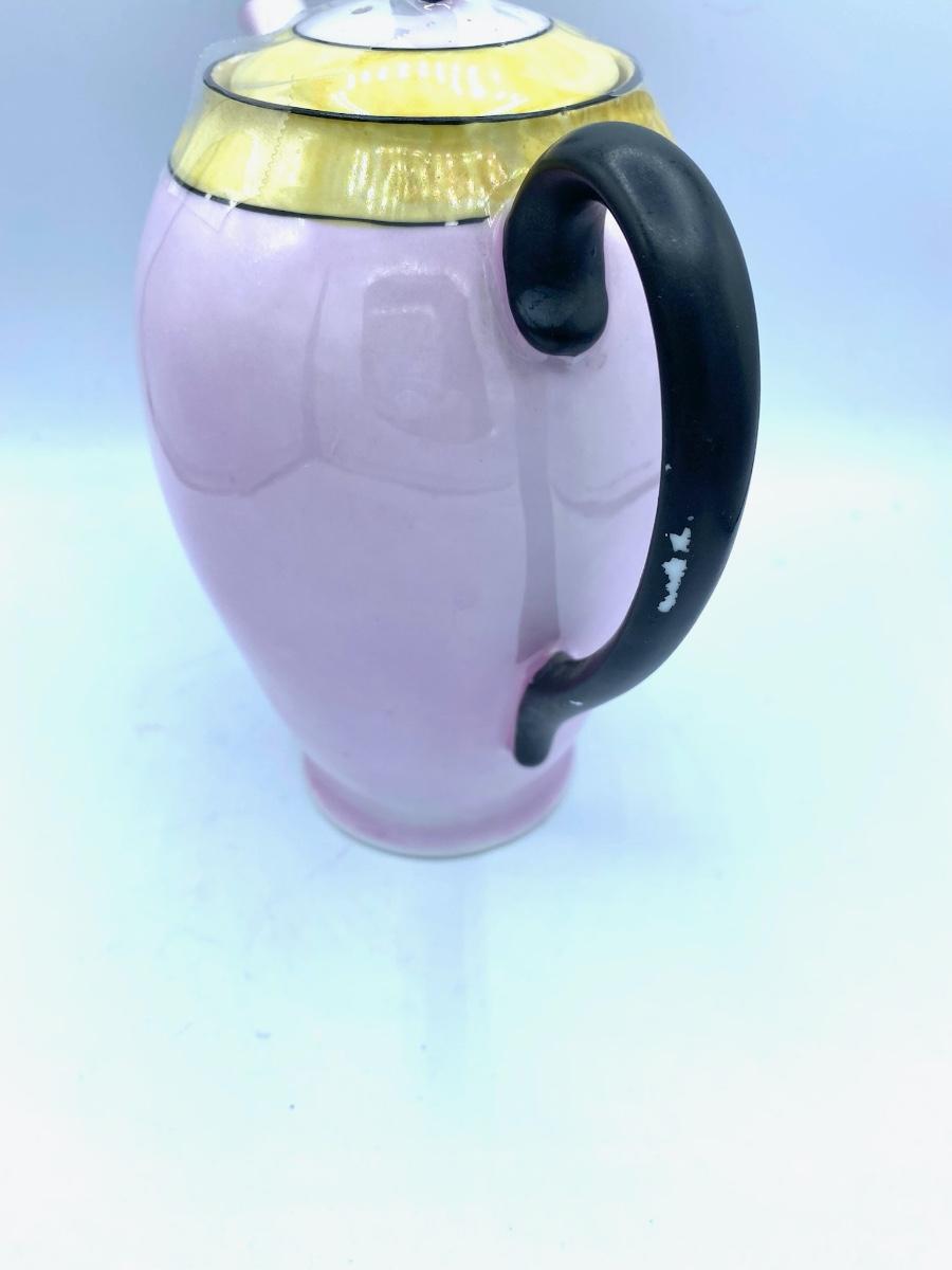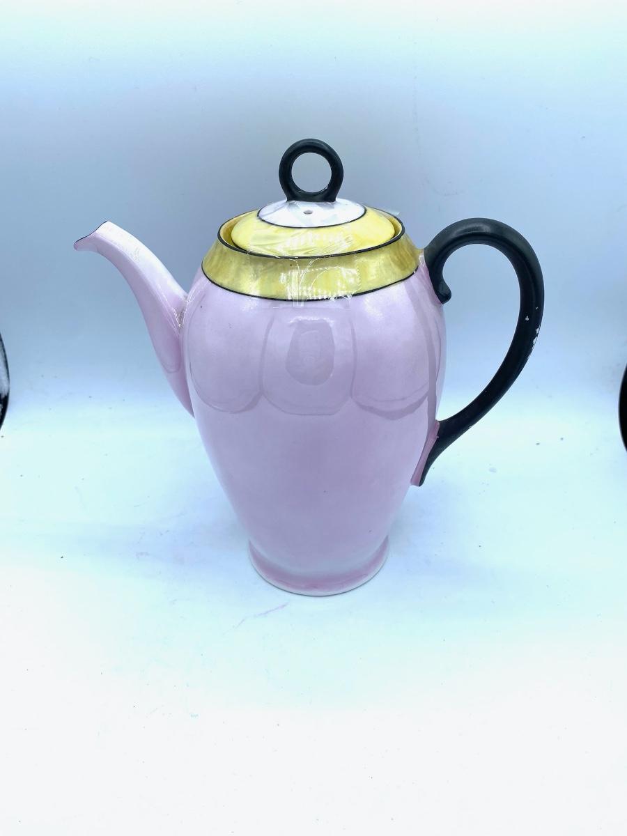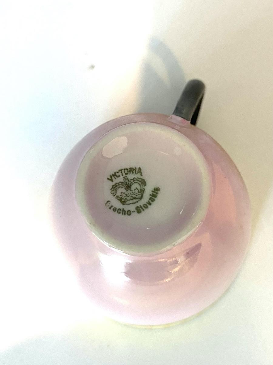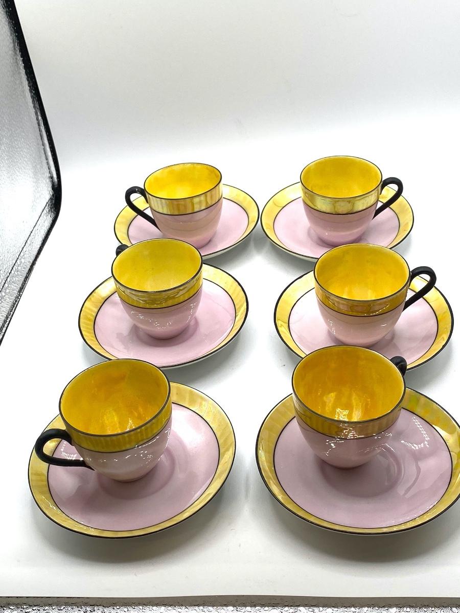 Set of six demitasse by Victoria Czechoslovkia. The company was founded in Austria but after WW1 the territory became Czechoslovakia. Victoria was in business until 1945. This set is delightful with The iridescent sheen on the pink and yellow bodies of cupand saucer are highlighted by black trim. Very special, and even modern looking. Cup 2 1/4 "height and mouth 2 1/2", saucer 4 1/2. coffee pot height 8 1/2 ", length handle to end of spout 7 1/2". Please note minor scratch on handle which could be touched up.