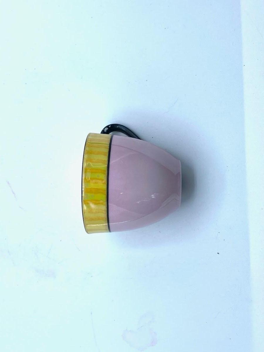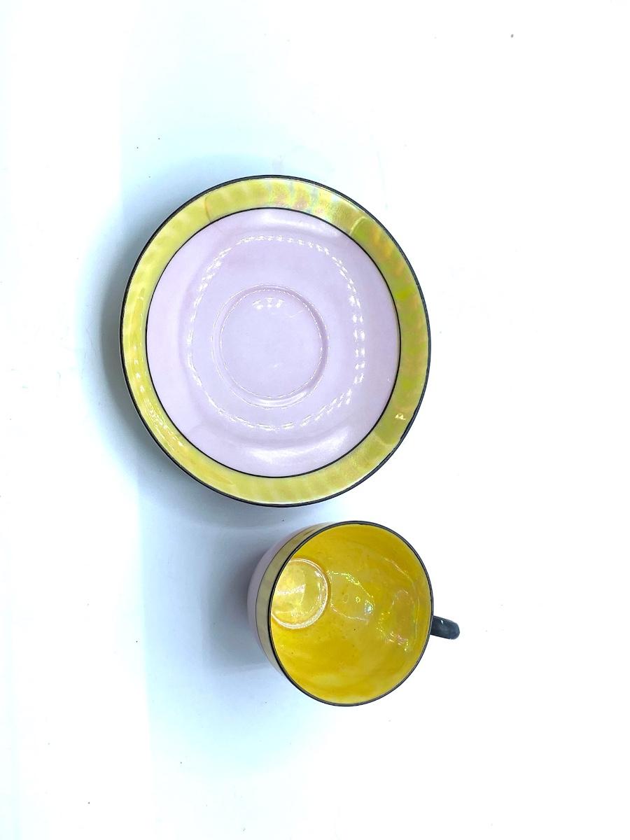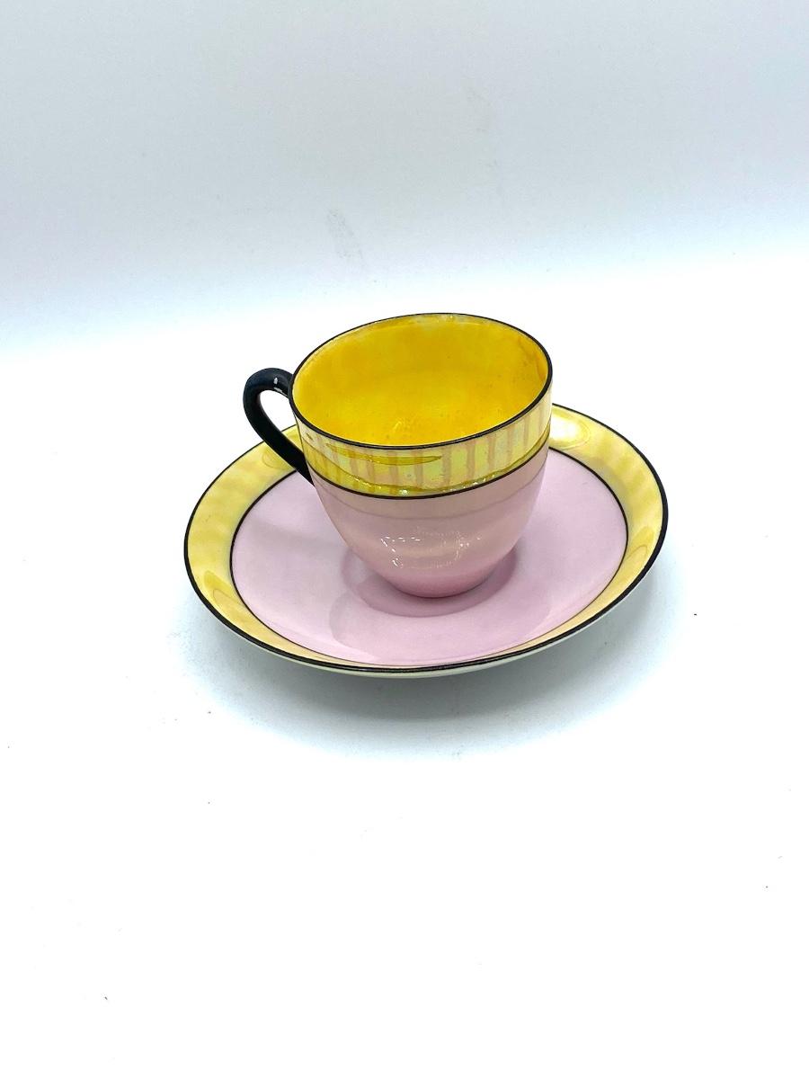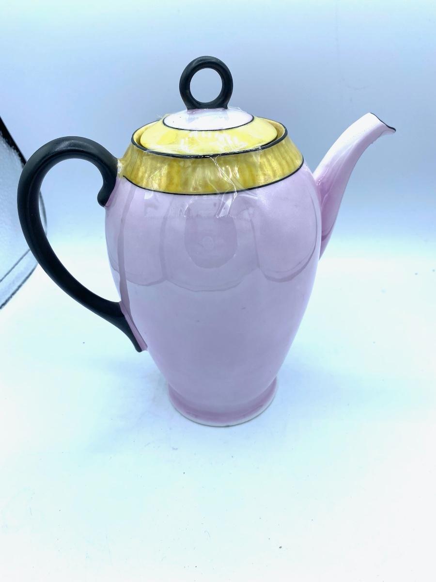 Set of six demitasse by Victoria Czechoslovkia. The company was founded in Austria but after WW1 the territory became Czechoslovakia. Victoria was in business until 1945. This set is delightful with The iridescent sheen on the pink and yellow bodies of cupand saucer are highlighted by black trim. Very special, and even modern looking. Cup 2 1/4 "height and mouth 2 1/2", saucer 4 1/2. coffee pot height 8 1/2 ", length handle to end of spout 7 1/2". Please note minor scratch on handle which could be touched up.
