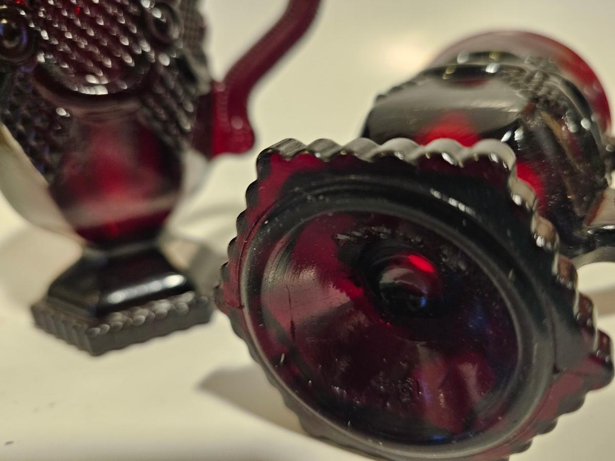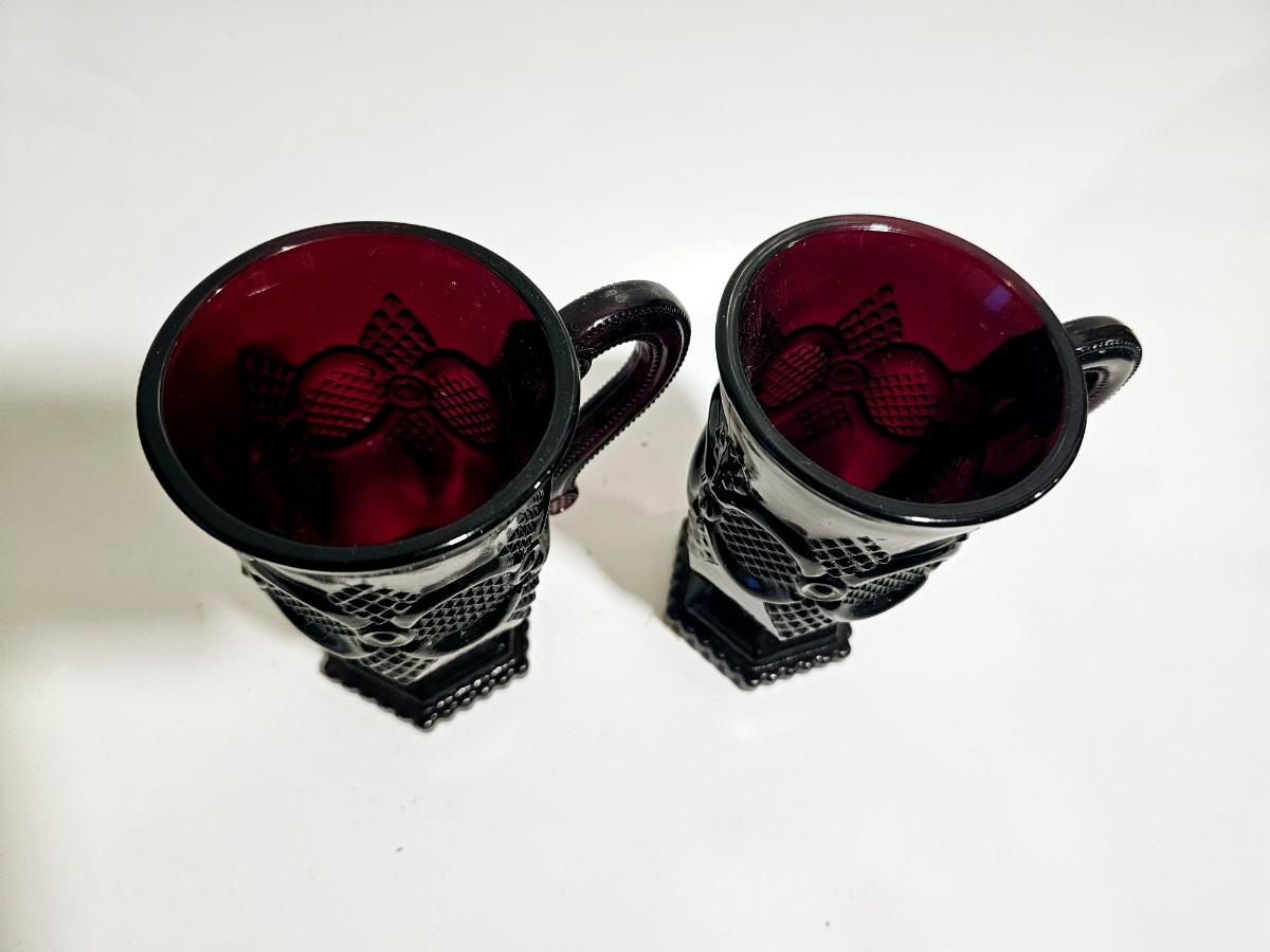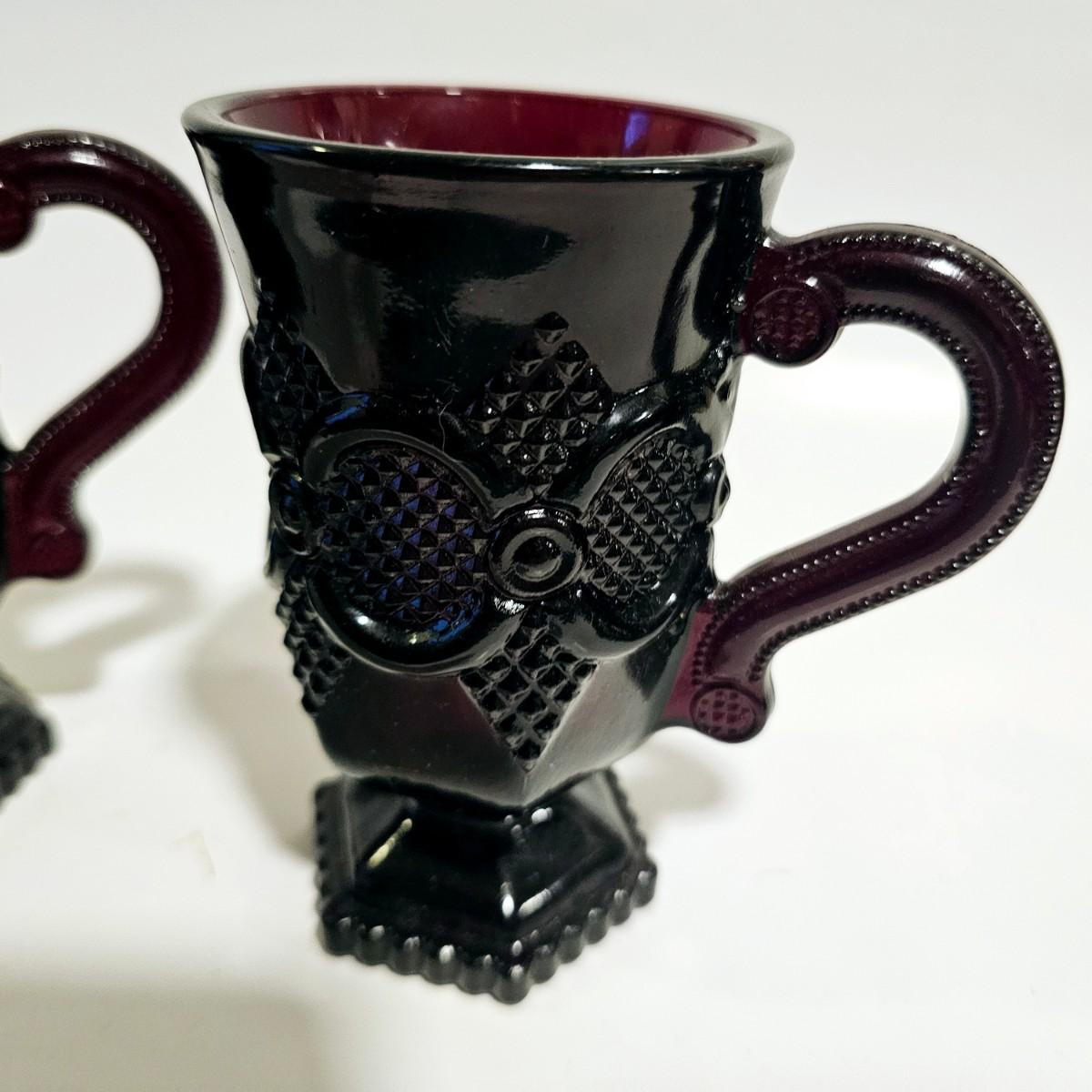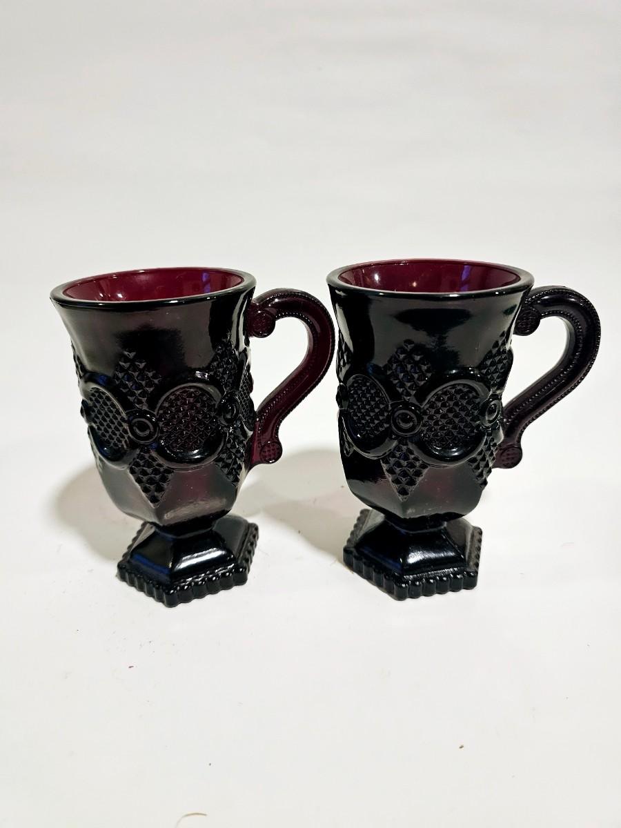 Collectable pedestal Avon dark red Mugs set of 6 with some boxes - cranberry cape cod 1888 style made as a reproduction style by Avon in the late 1900s (1970s) for the collector market