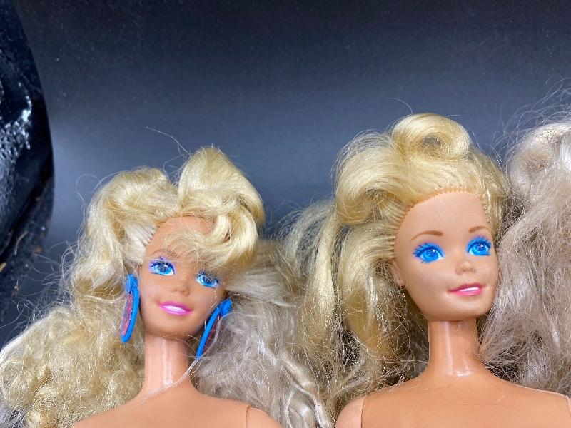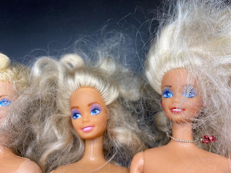 Lot of 6 vintage blonde Barbie's. From the 1980s more then likely. All are naked, messy hair. Some have jewelry on. All but one are bent arm. In need of a little TLC.